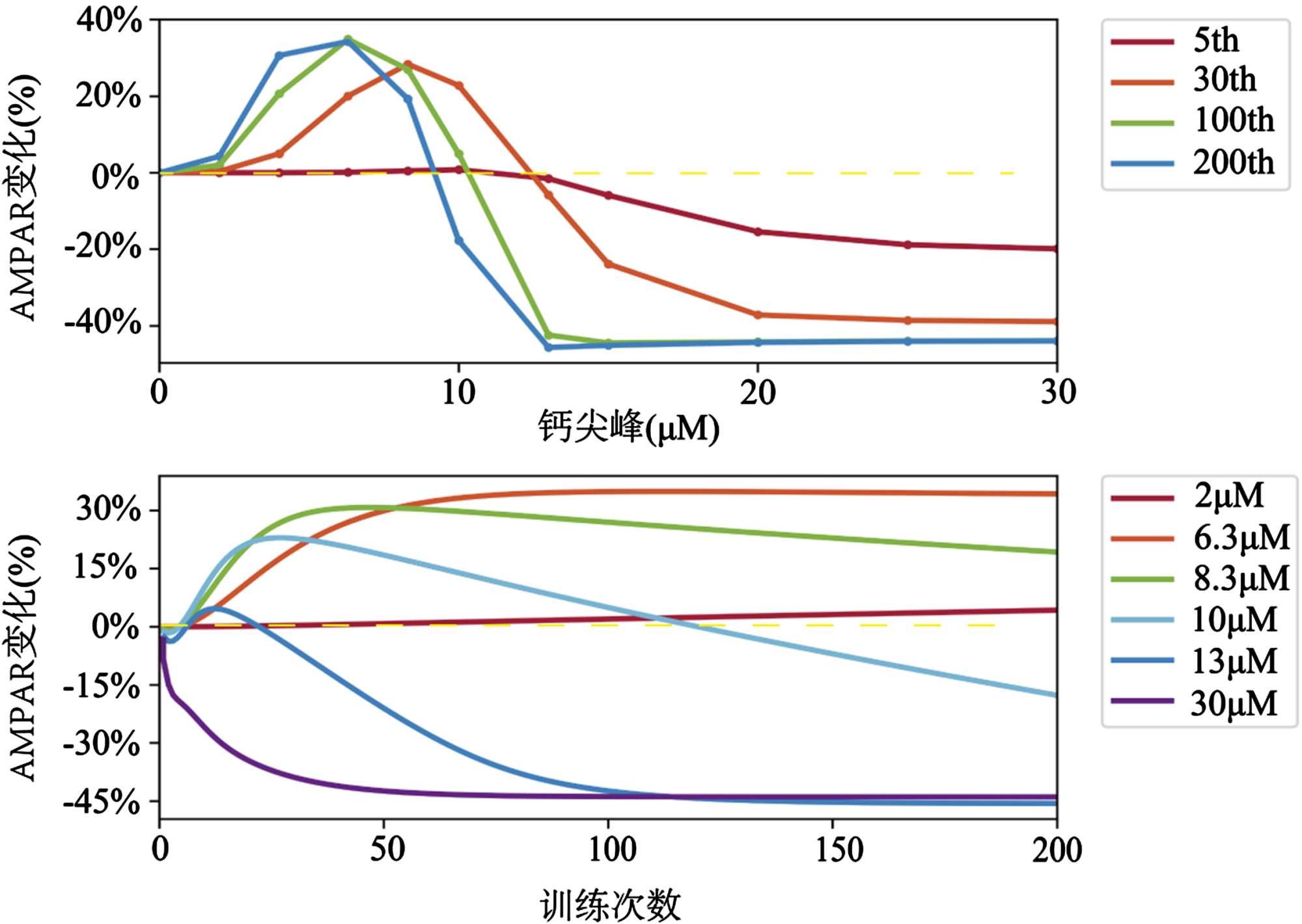 如图3所示,上部分图不同曲线代表了不同训练次数下AMPAR浓度随钙尖峰的变化,下部分图是不同钙尖峰下AMPAR浓度随训练次数的变化。上部分图中钙尖峰0到2 uM对AMAPR浓度几乎没有影响,因此认为该区间无可塑性;从2 uM开始,训练30次、100次和200次后的AMAPR浓度都远远高于初始值,随着训练次数上升,AMPAR浓度回到初始值时对应的钙尖峰从12.2 uM逐渐下降到9.1 uM,这几个从2 uM到不同钙尖峰结束值的区间分别是这几个不同训练次数曲线的LTP区间,然而训练5次后的曲线几乎无LTP。LTP区间后AMPAR浓度低于初始值,是LTD区间。因此可得出结论,在学习效果突显后,随着训练次数增加,可塑性方向转换的阈值逐渐下降。
