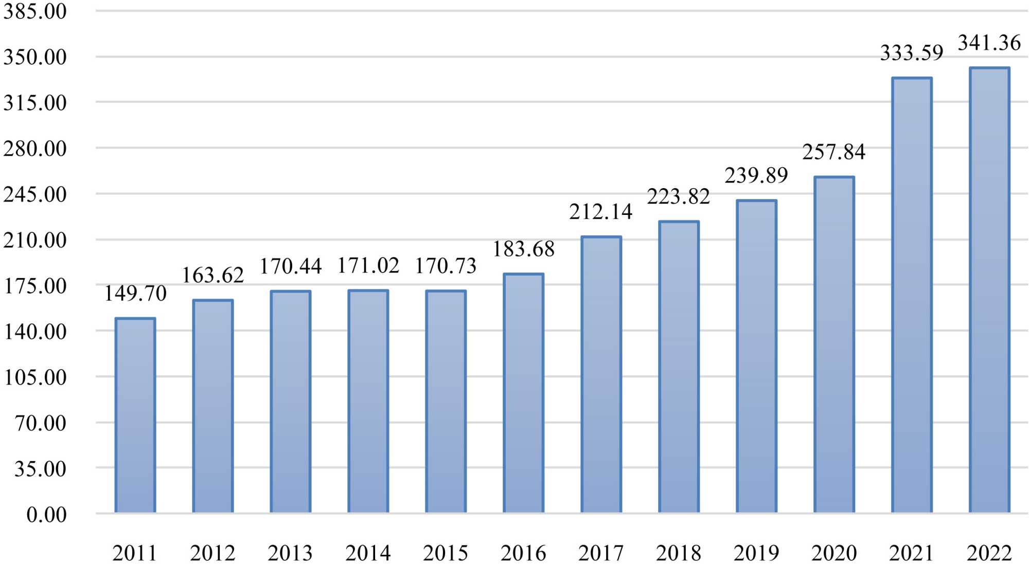 Figure 1. China’s agricultural products exports to ASEAN, 2011~2022 (USD 100 million)