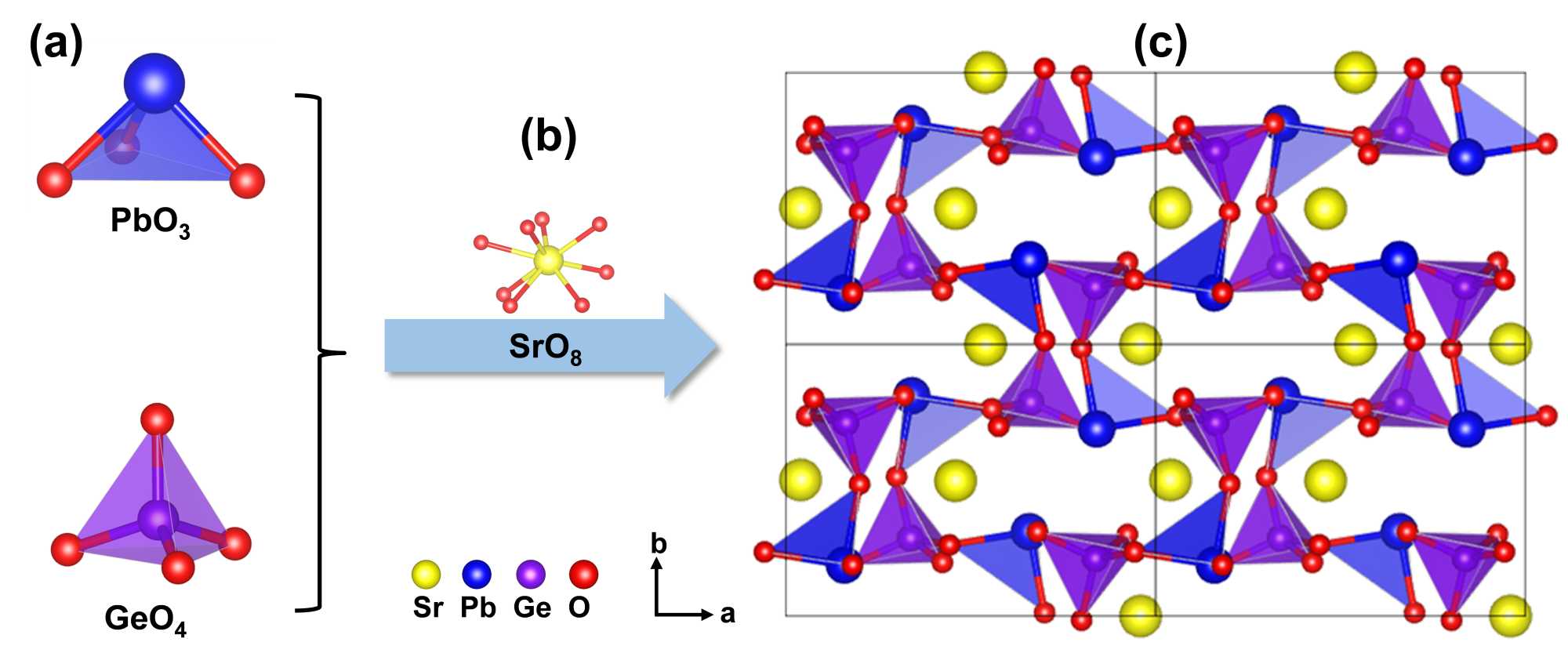 图2. (a) 三角锥形的[PbO3]基元和四面体形的[GeO4]基元;(b) [SrO8]多面体基元;(c) PbSrGeO4的三维框架图[13]