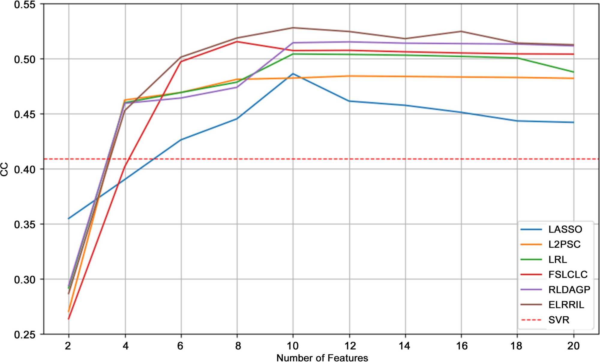 图1展示了不同方法的RMSE和CC在筛选特征数量变化时的变化趋势。首先,任何方法的结果都是直接回归SVR,因为原始高维特征不可避免地包含冗余和噪声,这也证明了特征选择的必要性。其次,