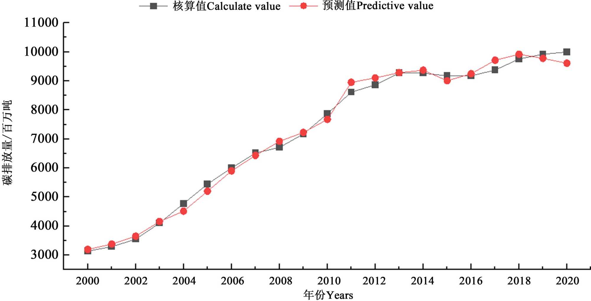 图1. 2000~2020年中国碳排放核算值与模型模拟值