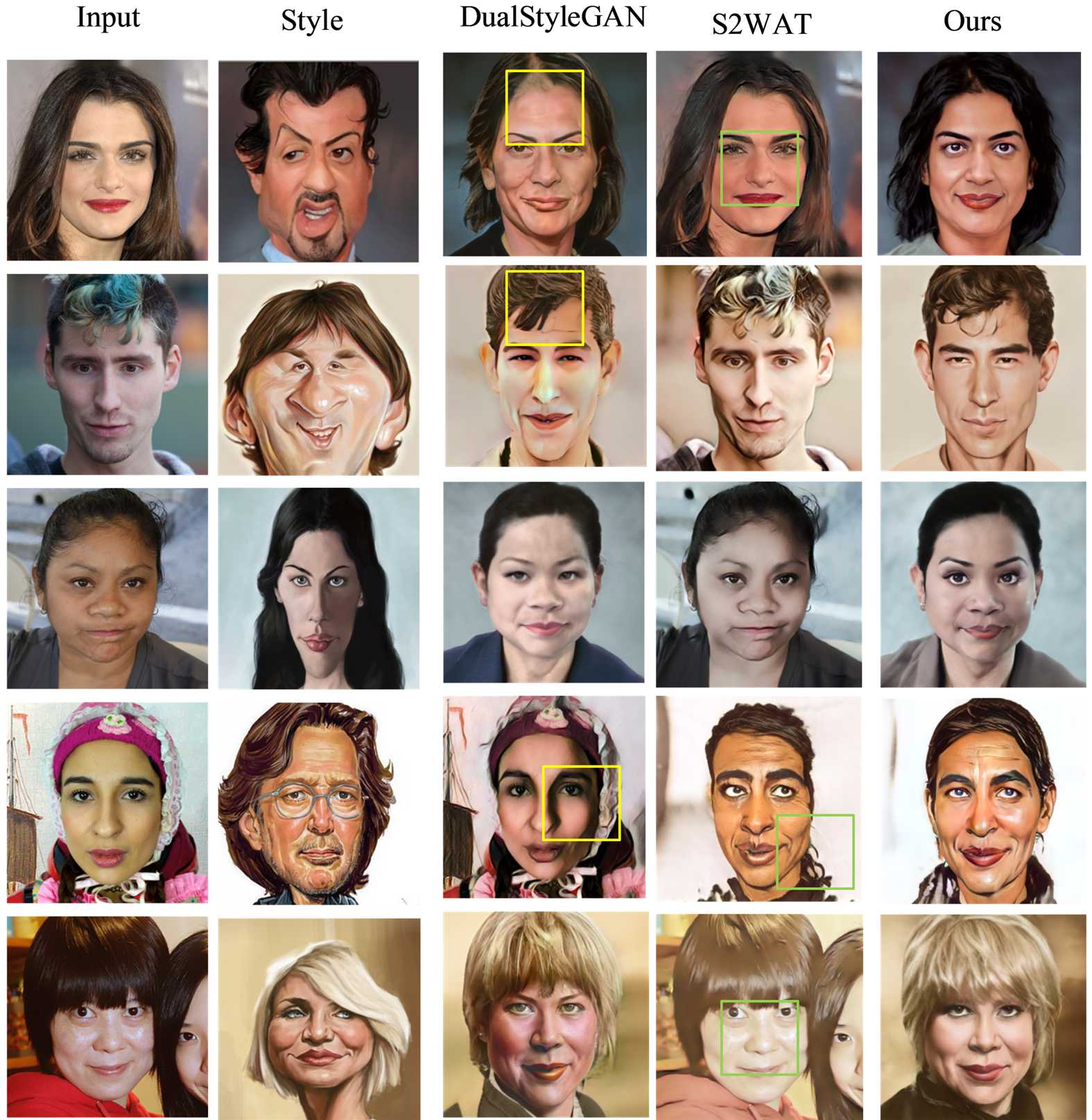 风格迁移技术主要分为传统风格迁移技术和神经风格迁移技术(Neural Style Transfer, NST)。传统风格迁移技术主要包括非真实感渲染[1]-[3] (NonPhotorealistic Rendering, NPR)和纹理迁移[4]-[6]。其中,NPR包括笔触渲染、图像类比和图像滤波三种方法,是利用计算机模拟中国画、水彩、版画等各种视觉艺术风格的绘制。纹理迁移技术根据参考图像对输入图像进行纹理填充,使得生成图像有和参考图像类似纹理。传统风格迁移技术可以较好应用于艺术作品的生成,但仍存在不足。随着深度学习的发展,卷积神经网络被应用于风格迁移。神经风格迁移技术是一种基于优化技术将参考图像风格转移到输入图像中的风格迁移方法。Gatys等人[7]提出基于VGG (Visual Geometry Group)网络[8]的神经风格迁移模型,基于统计参数根据全局统计信息来进行风格匹配,首次运用神经网络模型来实现风格迁移。为了解决Gatys模型效率低下的问题,Johnson等人[9]提出一种基于前向传播(Feed-forward)的优化模型,使用感知损失函数构建前馈网络进行风格迁移,完成实时图像风格迁移任务。在此基础上,单个模型多种风格迁移算法被提出,Karras等人[10]提出了StyleGAN模型,一种基于生成对抗网络(GAN)的生成器框架。使用低分辨率的图像训练生成器和鉴别器,依次增加更高分辨率的层,最终得到迁移结果,但是该模型生成的图像存在水滴状伪影。为了解决此问题,Karras等人提出了StyleGAN2模型[11],重新设计了生成器归一化,并对生成器进行了正则化。在此基础上,Yang等人[12]提出了DualStyleGAN模型,该模型在StyleGAN2的基础上使用内在风格路径和外在的风格路径来刻画图像的内容和风格。能够分层地调节颜色和复杂的结构样式,实现风格的精确迁移,但是该模型仍存在风格迁移效果不明显、不准确,局部纹理不合理等问题。