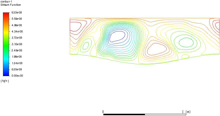 图10为高度0.5,振幅为0.06,长度6时不同瑞利数下的流函数分布,可以看出,小瑞利数下流函数对称,形成对涡结构,随着瑞利数增加,当瑞利数增大到107的时候,流函数的对称结构被破坏,在两个大涡中间又形成许多小涡。当瑞利数达到1010的时候,流线图从一边贯穿到另外一边,没有观察到上方几乎水平的流动。