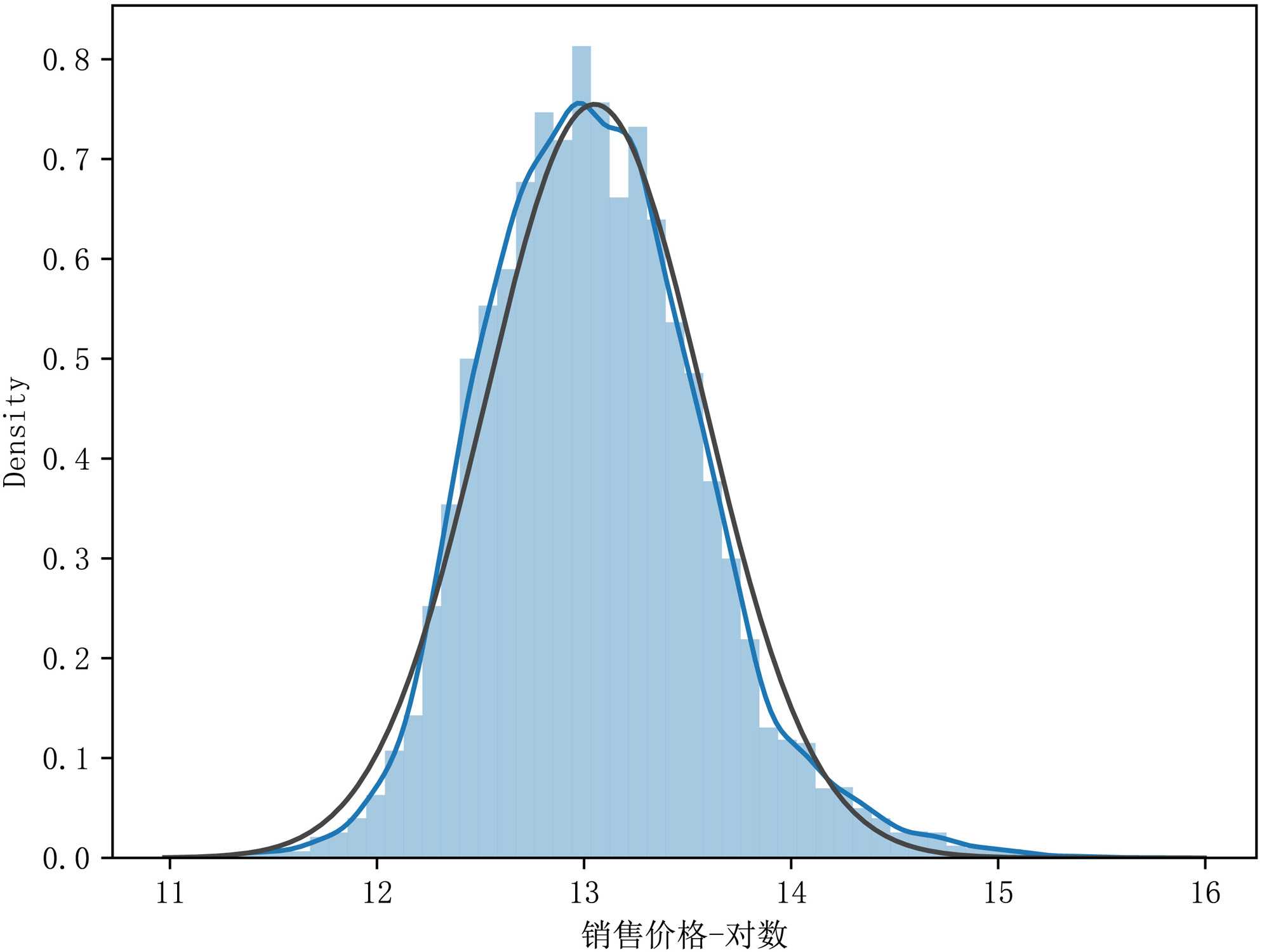采用对目标变量取对数的方法,使其右偏分布近似转化成正态分布,以便于后续的模型构建,取对数后的分布图如图3所示,销售价格基本上符合正态分布。