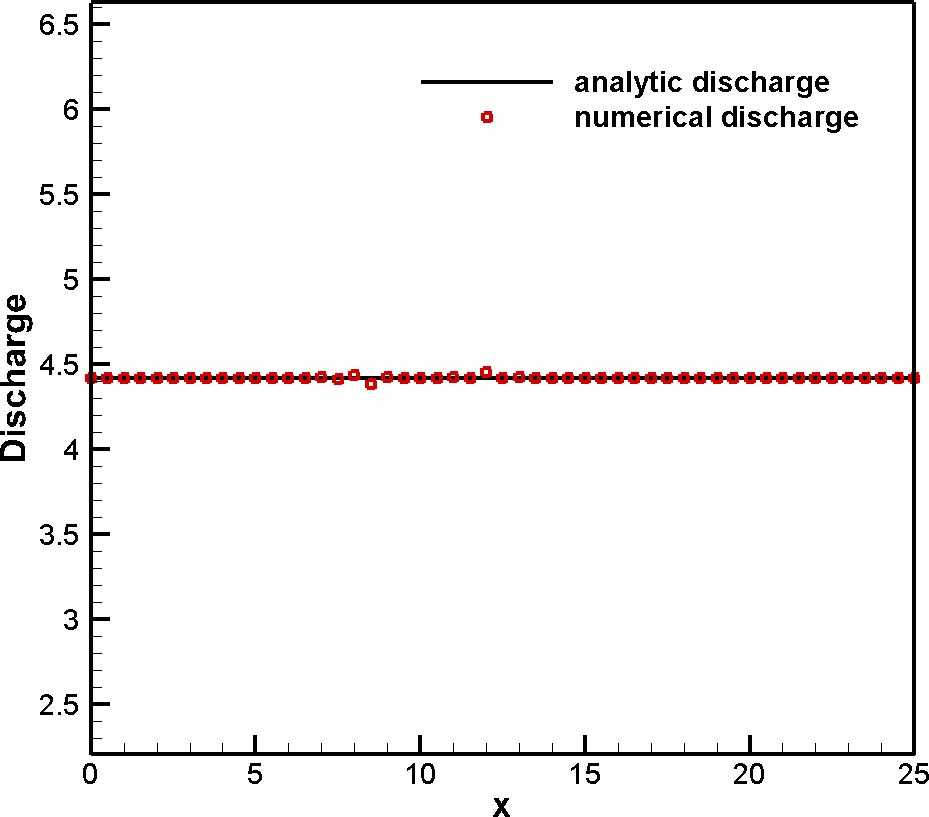 我们取200个均匀的计算单元,并将最终时间设为t = 200,当水流达到静水稳态时。根据不同的边界条件,流量可以是亚临界或跨临界的,有或没有稳定激波。为了便于比较,我们还提供了解析解,其计算方法如[15]所示。具体来说,为了得到沟渠中每个网格点的解析解,我们求解了一个三次方程,该方程来源于每个分支的水头的强制保护。此外,激波两侧的两个剖面通过跳跃条件连接。