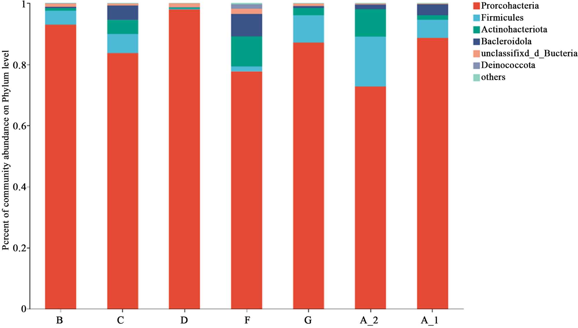 6组辣椒粉和1组花椒粉样本中共鉴定出5个门、6个纲、24个目、57个科和91个属。在门水平方面,样本中相对含量较高的门有变形菌门(Proteobacteria)、厚壁菌门(Firmicutes)、放线菌门(Actinobacteriota)和拟杆菌门(Bacteroidota),4种优势门的平均相对含量均大于1%,分别为84.27%、8.93%、4.72%和1.5%,D组样本中无拟杆菌门,且厚壁菌门和放线菌门相对含量也较低,仅有0.35%和0.37% (图4)。进一步在属水平方面对辣椒粉样本种的微生物菌群结构进行分析,样本中相对含量较高的属有泛菌属(Pantoea)、假单胞菌属(Pseudomonas)、葡萄球菌属(Staphylococcus)、不动杆菌属(Acinetobacter)、芽孢杆菌属(Bacillus)、普罗维登斯菌属(Providencia)、沙雷氏菌属(Serratia)、黄单胞菌属(Xanthomonas)和鞘氨醇杆菌属(Sphingobacterium),9种优势属的平均相对含量均大于1%,分别为39.79%、20.01%、3.08%、2.72%、1.79%、1.44%、1.41%、1.28%和1.23%,D组和F组中无葡萄球菌属、不动杆菌属和芽孢杆菌属等优势