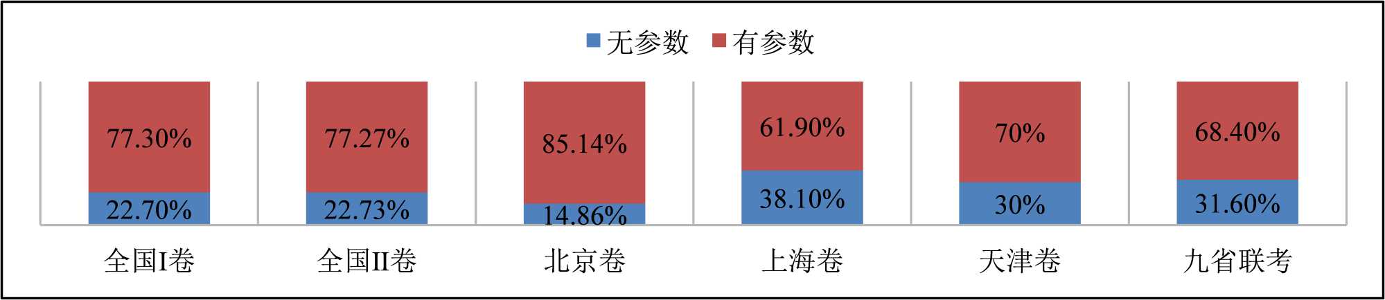 由图2可知,含参量题量最多的是北京卷,含参量题量最少的是上海卷,九省联考的含参量处于中等水平。仔细观察可以发现,这6套试卷中有参数的题量都多于无参数的题量。按照难度模型来看,这6套试卷在是否含参的难度比较是:北京卷 > 全国I卷 = 全国II卷 > 天津卷 > 九省联考 > 上海卷。