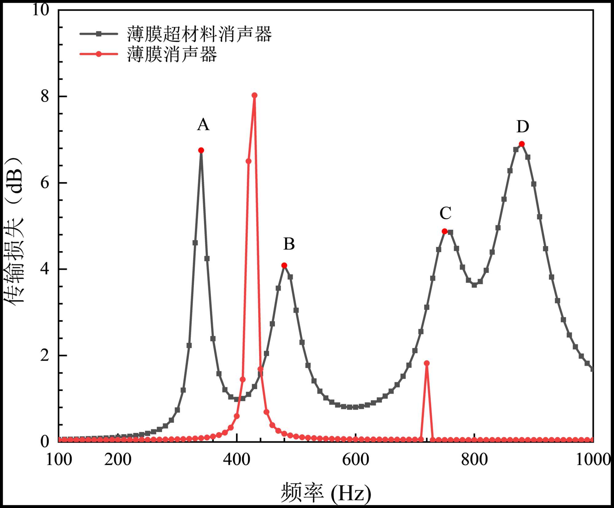 通过仿真双单元结构的有限元模型获得其传递损失如图9所示,图中黑色曲线为膜张力为0.12 MPa时单个单元的传递损失,红色曲线为双单元结构的传递损失。从图中我们可以看到,在1000 Hz以下,双单元结构的整体传递损失数值与单个单元相比获得了提高,最高为1000 Hz时,传递损失值达到18 dB。