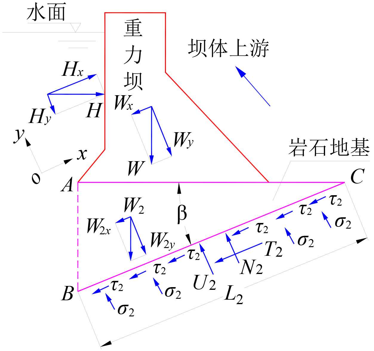 而由重力坝和岩石地基的重量以及坝体上游水压力所引起的下滑力为T2,则抗滑力R2与下滑力T2的比值即为岩石地基受深层单斜剪切滑移面BC控制的抗滑稳定系数ks2,其表达式为