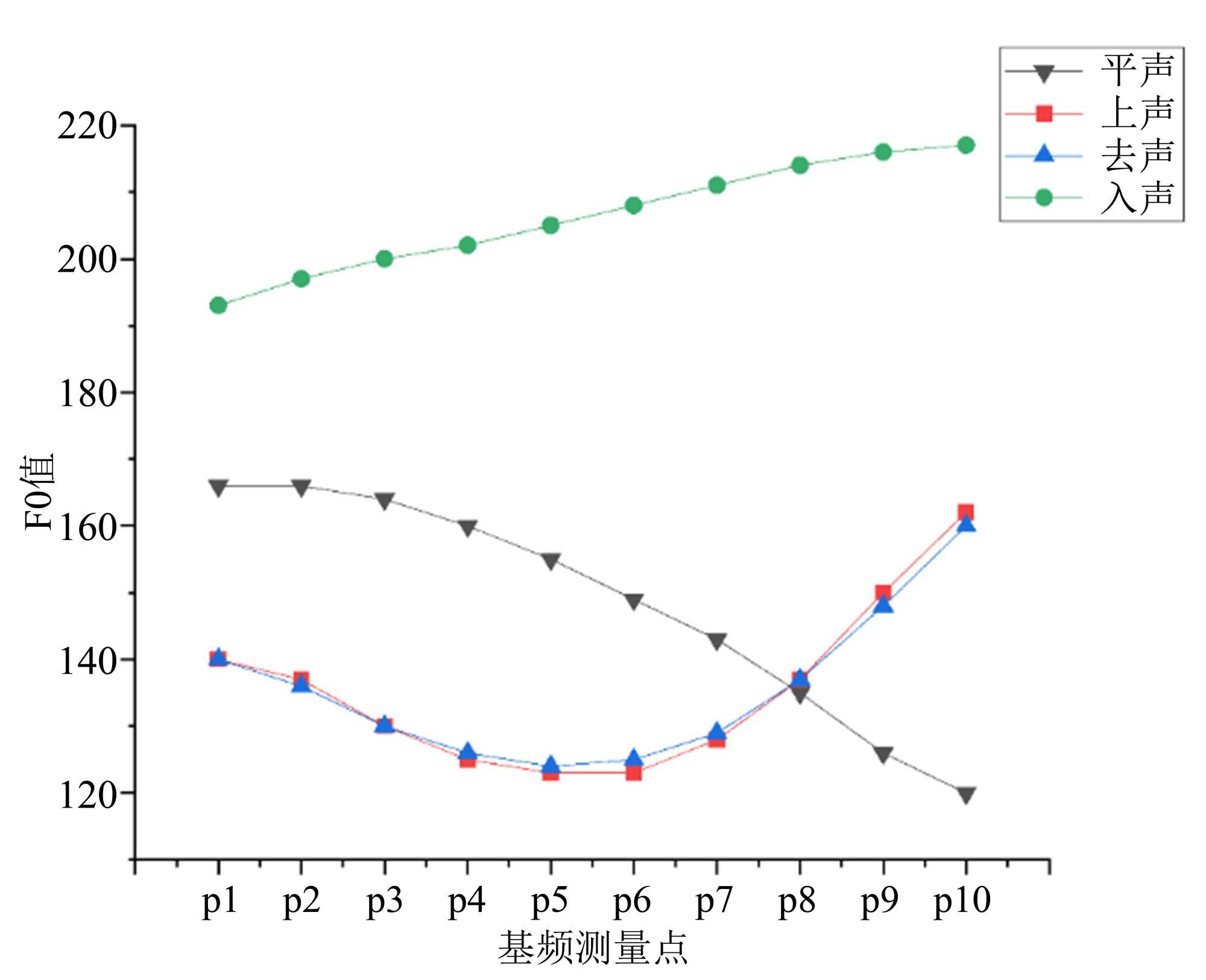 将.wav声音文件、对应的Textgrid文件以及PitchTier文件保存在电脑Temp文件夹中。打开Praat软件选用脚本提取音高数值,设定每个样本提10个基频点。将基频数据导入至Excel表格中,以便后续分析研究。之后计算出每个调类各基频点的平均值和标准差,然后筛选出更精准的数据进行后续研究。