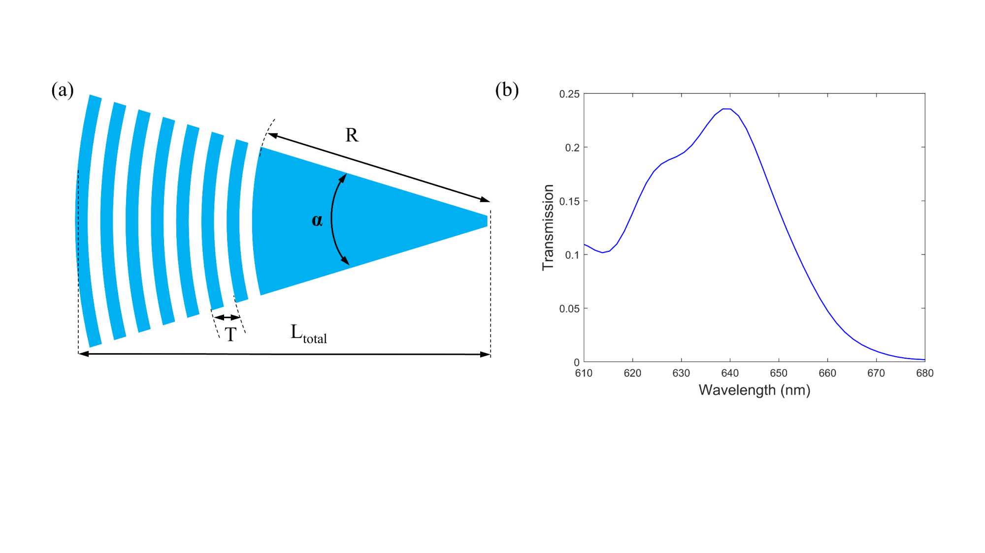 针对光栅的设计和优化,本文使用商业三维时域有限差分法仿真软件(FDTD Solutions, Lumerical)完成。光栅仿真区域大小设置为Dx = 42 μm,Dy = 20 nm,Dz = 5 nm。采用完美匹配层用作边界条件,层数设置为8。使用自动非均匀网格,该网格可以自动匹配物理结构的周期性,网格精度选择为4,即最小网格间距约为20 nm。采用高斯光源进行激发,通过透射谱监视器逐步优化光栅结构参数。光栅结构如图1(a)所示,经优化后当光栅的角度α = 34˚,光栅总长度Ltotal = 50 μm,光栅周期T = 0.474 μm,占空比为0.5,光栅不刻蚀区域半径R = 25 μm,刻蚀深度为220 nm,SiN层和SiO2层的折射率分别为nSi = 1.927和nSiO2 = 1.445,耦合光纤入射角度为80度时,光栅透射谱如图1(b)所示,透射率最高为23.6%。