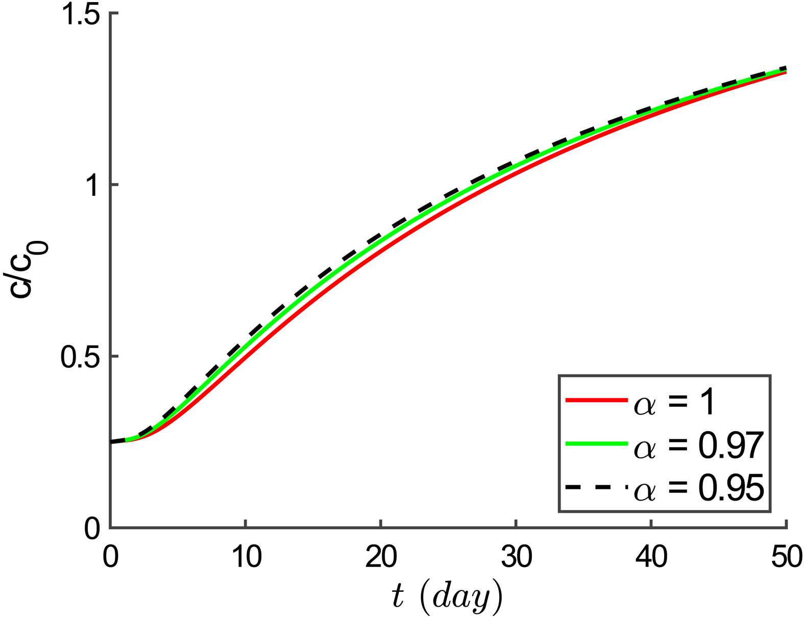 在数值方法中,我们对一阶空间导数项应用向后差分,对二阶空间导数项应用二阶中心差分,时间分数阶导数项应用L-1格式来近似,模型(11)、(8)~(10)的数值格式请参考附录。附录中只要满足在时间和空间步长足够小的情况下,其数值解会一致收敛于精确解。模型参数值来自于文献[11],例如,