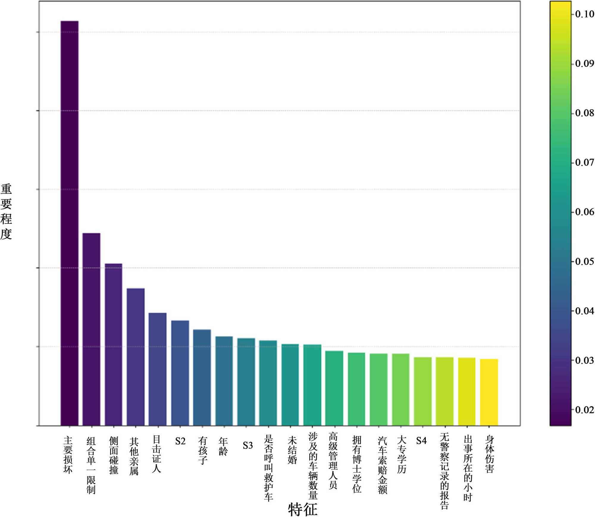 图2显示了在随机森林的特种贡献度下,主要损坏特征的贡献度最为突出,其次是汽车索赔金额、出险日期等。这说明保险公司在识别保险诈骗的过程中应该重点关注汽车的损坏程度以及保险的索赔金额等贡献度较大的指标。