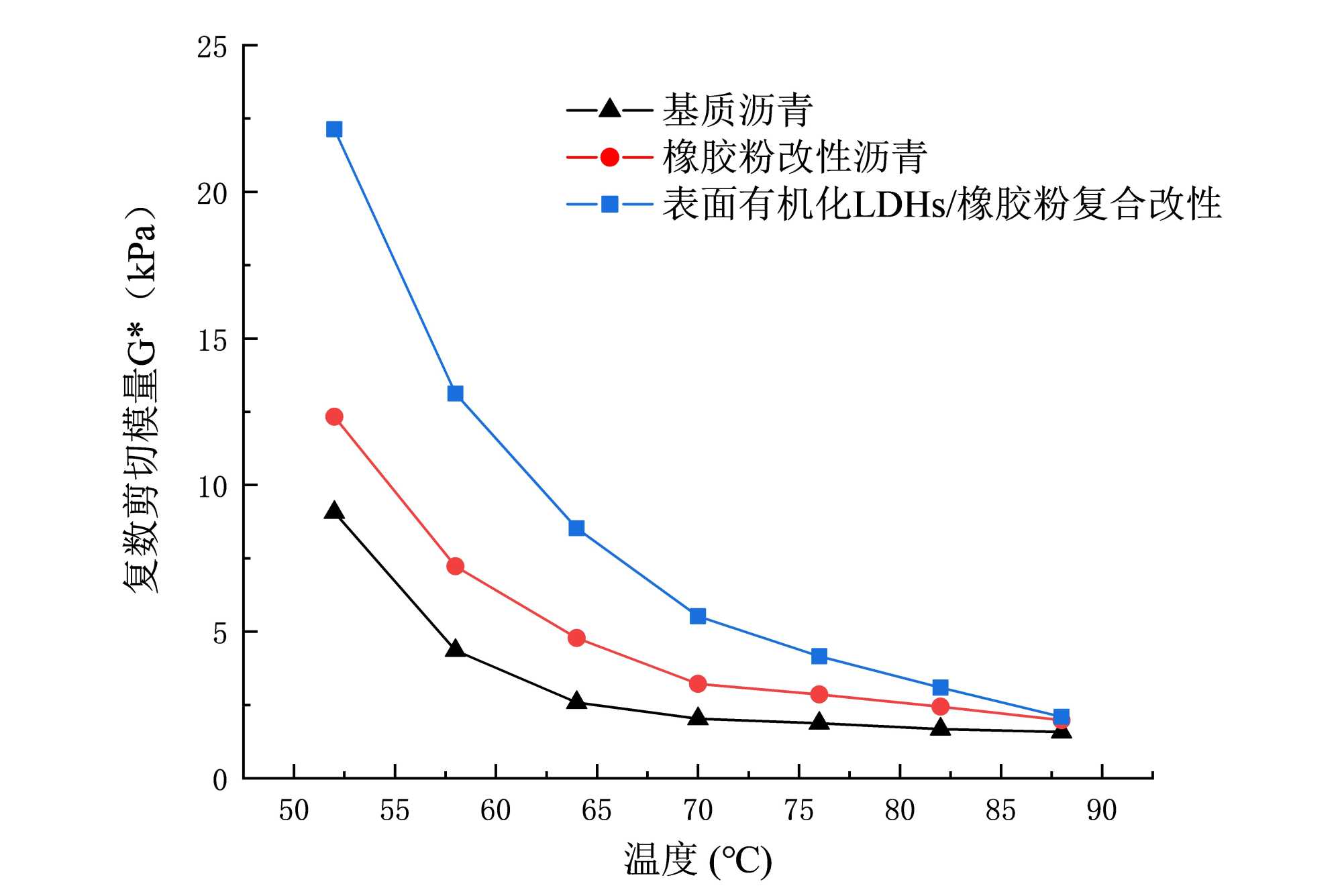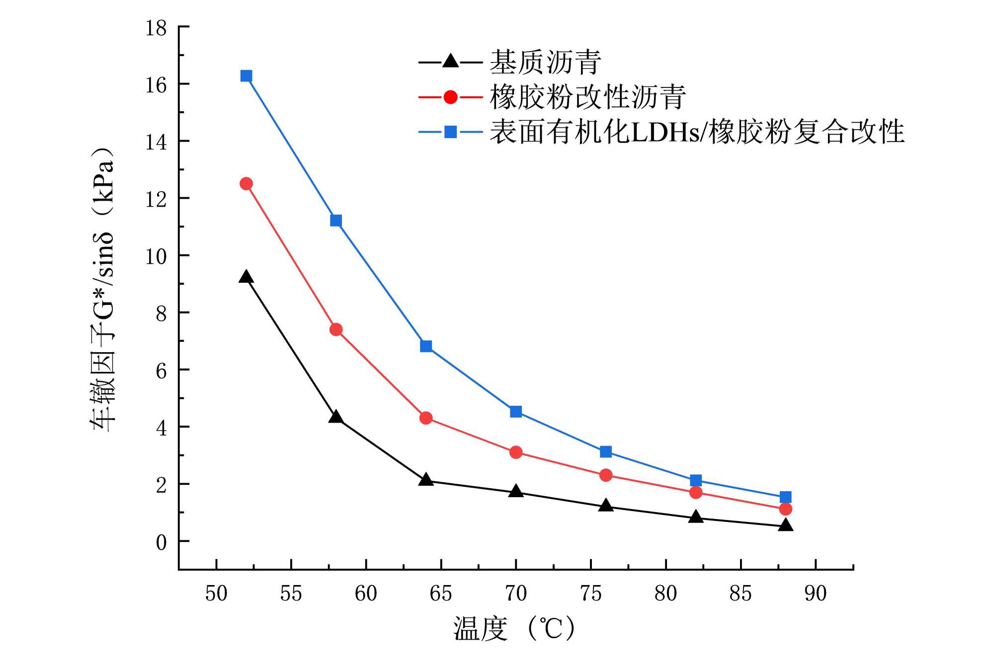 3) 在DSR试验中,将不同温度下的车辙因子进行对比分析,结果表明:随着温度的升高,在52℃、58℃、64℃、70℃、76℃、82℃、88℃这7个温度条件下,表面有机化LDHs/橡胶粉复合改性沥青大于橡胶粉改性沥青、基质沥青。结果表明,加入表面有机化LDHs后,沥青的抗车辙能力得到了显著地提高。
