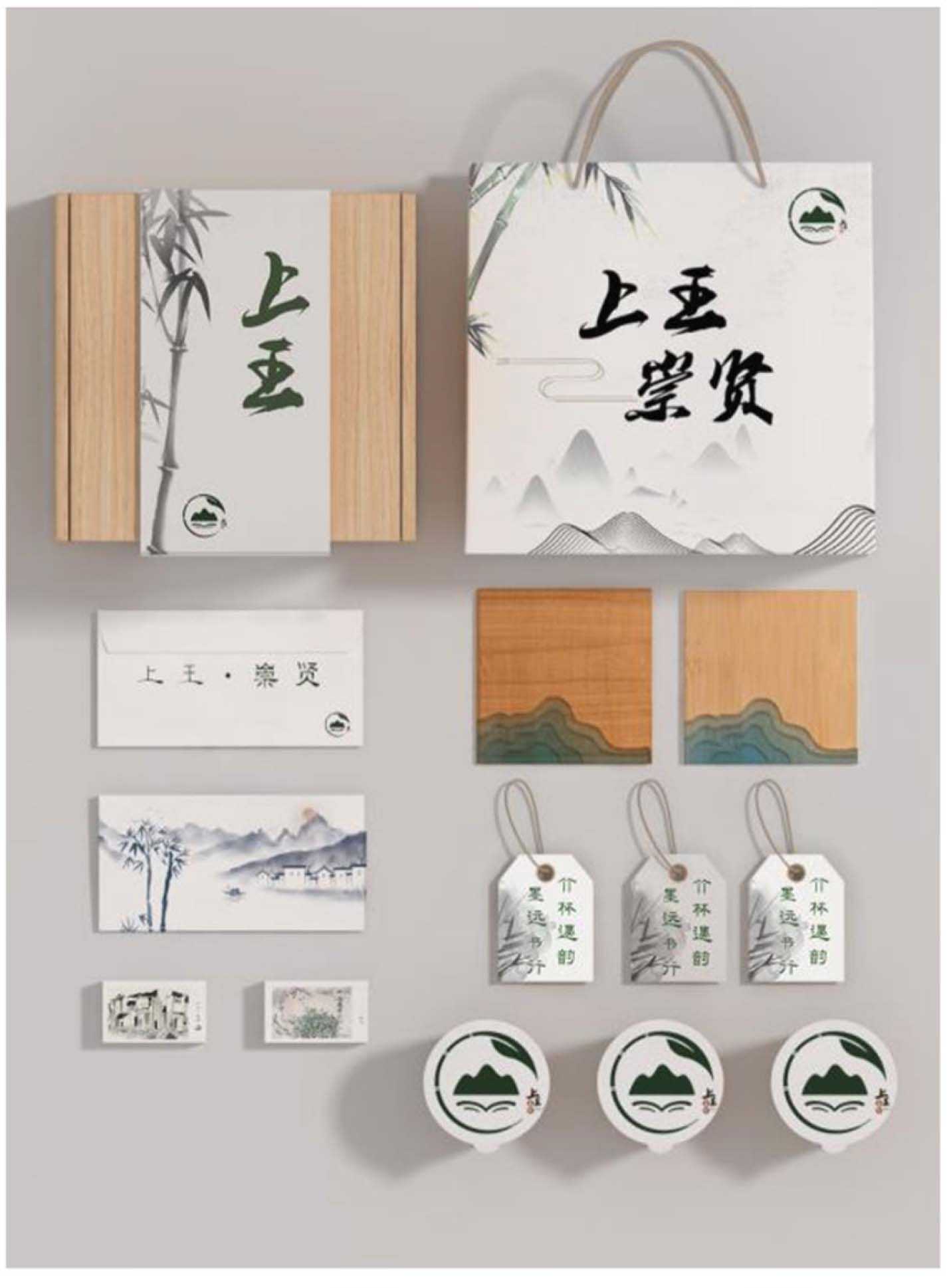 礼盒包含以下内容:日历以上王村风景的摄影日历,既可以观看上王风貌,又具备实用功能;明信片以上王村风景图为主,水墨风格,配以乡贤书法;环保袋为帆布材质,便携实用的同时宣传绿色生态,保护环境理念;研学衍生品学生作品可定制成书签、明信片等等;折扇上面有配有乡贤书法,见图5。