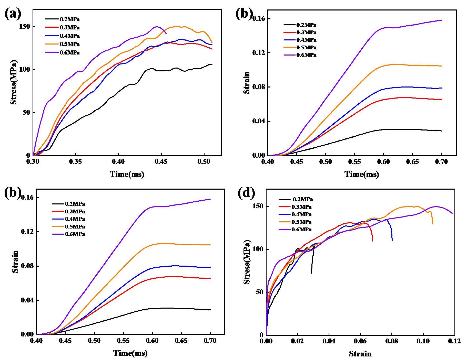 Figure 4. Dynamic compression curves of 6061 aluminum alloy under different impact pressures (a) Stress-time; (b) Strain-time, (c) strain rate-time; (d) Stress-Strain