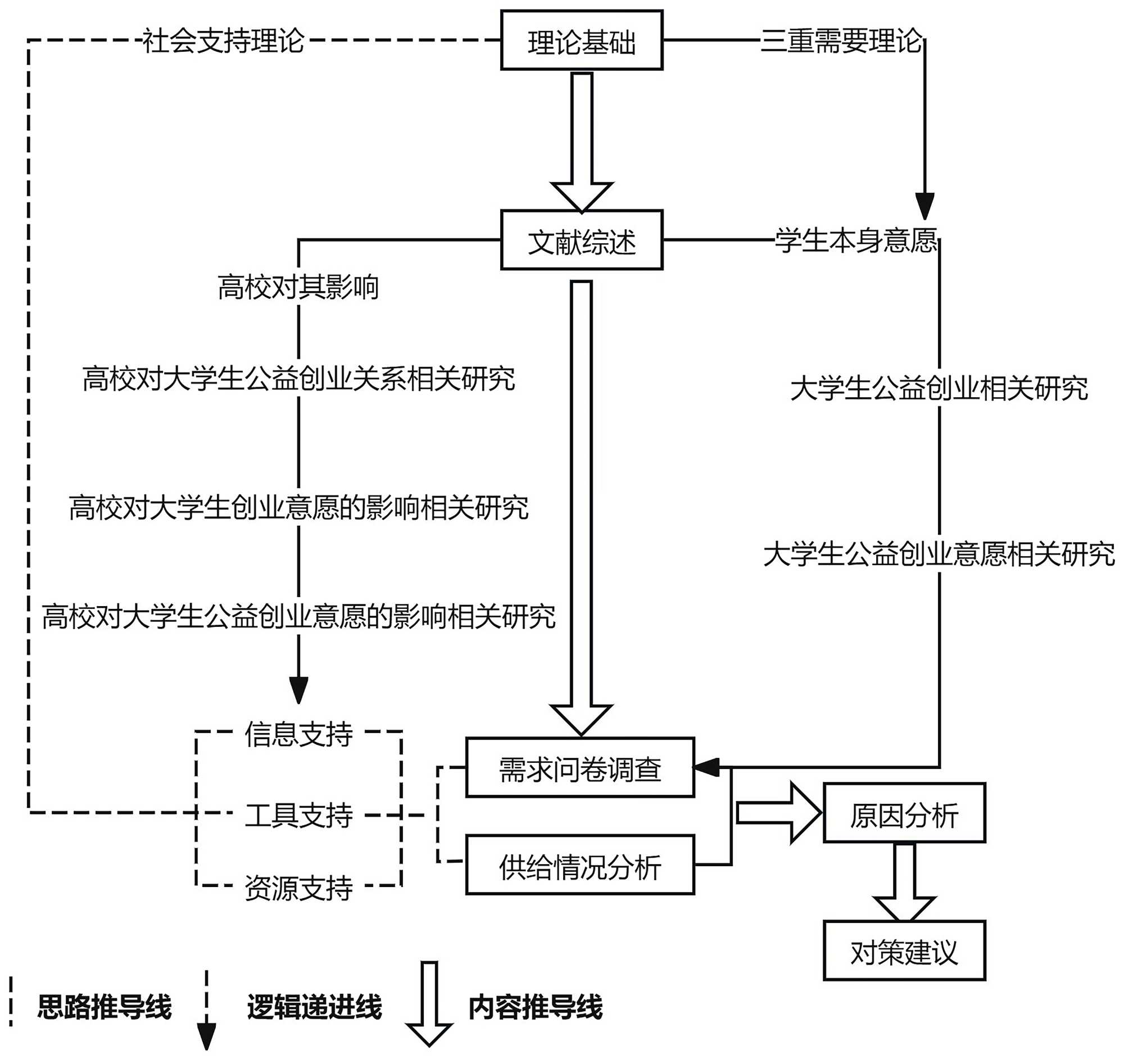 本文将社会支持理论引入到高校对大学生公益创业的研究中,构建了信息支持、工具支持和资源支持三个维度的分析框架,这为后续研究提供了理论基础。并采用问卷调研和文献分析相结合的方法,从需求和供给两个角度全面分析了高校支持的现状,这种研究方法更加系统和全面,补充现有公益创业研究文本分析的不足。