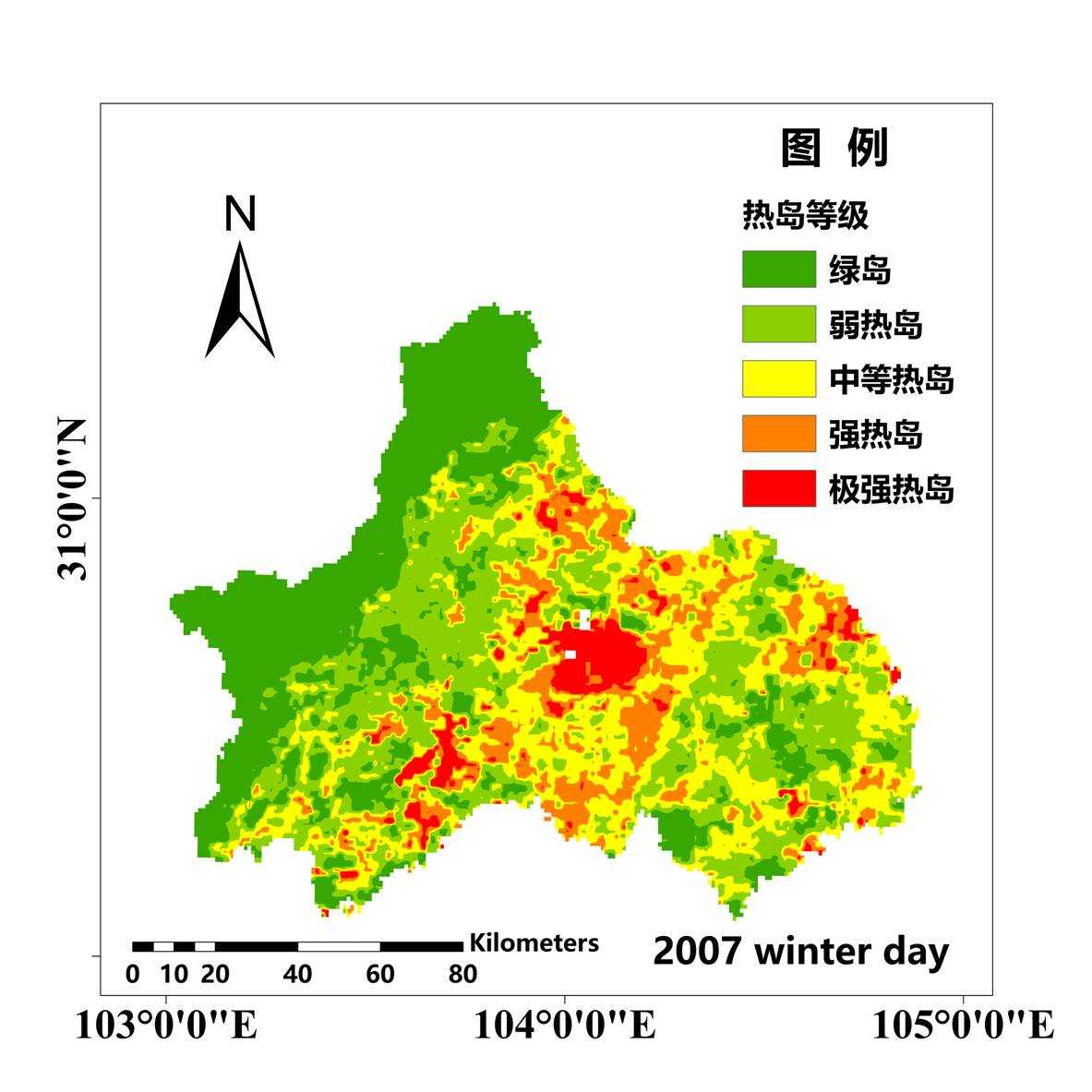 虑由于成都平原的地理位置等情况,冬季采暖的能耗导致中心城区的温度远高于郊区,夏季由于城区的绿植等规划使得热岛状况有所改善,也可能是夏季下垫面接受太阳辐射相对较多,温差减小导致夏季日间热岛等级相对降低[23]。