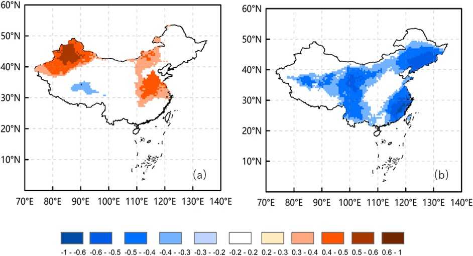 Figure 12. Distribution of NA0 and China temperature correlation, 1950~2020: (a) Spring; (b) Summer