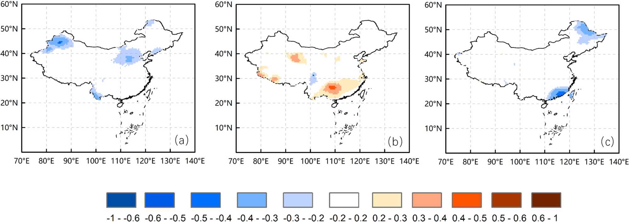 Figure 11. Distribution of NINO and China temperature correlations, 1901~2020: (a) Summer; (b) Autumn; (c) Winter