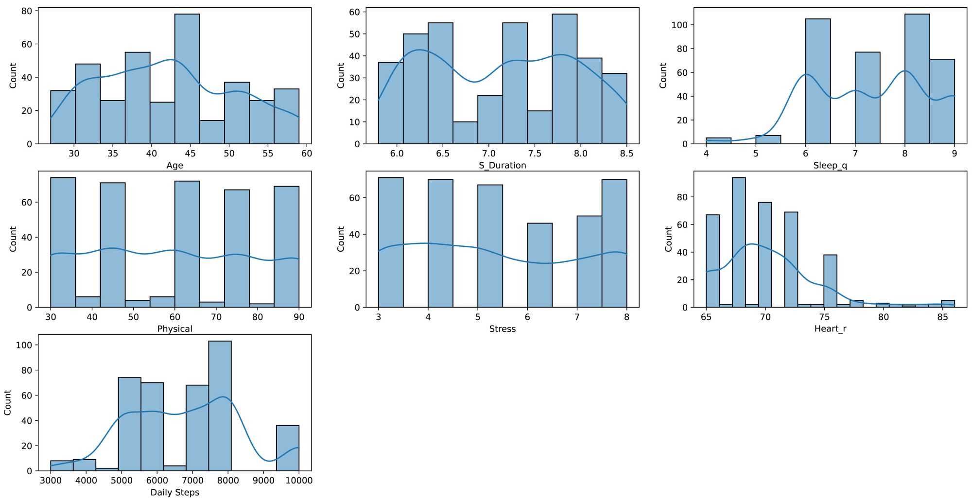 图5是连续变量数据分布可视化与核密度估计(Kernel Density Estimation, KDE)曲线图,KDE是一种可以帮助理解数据的分布特征的非参数统计方法,它可以使我们直观地了解到数据的某些特点如中心趋势、峰度、偏斜度以及数据点的密集度等。该图形使用python中Seaborn中的函数并结合matplotlib进行绘制。由图5可知,年龄、睡眠时间、身体活动水平、压力水平分布较为均匀。睡眠质量评分主要分布在6~9分,心率主要分布于65~80之间,每日步数主要分布于5000~8000步,整体规律较为平衡。