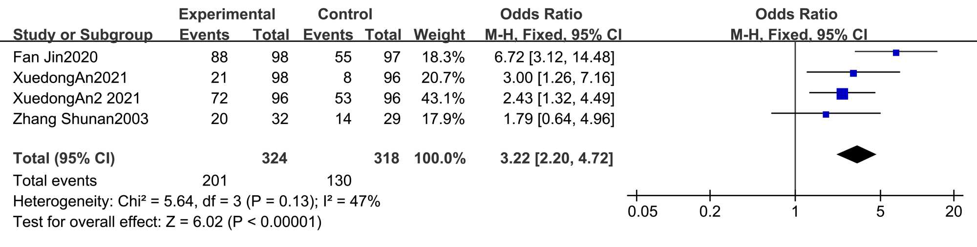 共有个7研究[15]-[17] [19]-[21]报告了临床症状情况,其中4项研究[17] [19] [21]描述了治疗前后症状改善例数,异质性检验结果显示各项研究之间无明显异质性(P = 0.13、I2 = 47%)。固定效应模型Meta分析结果表明与对照组相比,试验组的症状改善率更高[OR = 3.22, 95% CI (2.20, 4.72), P < 0.00001]。如图5所示。3项研究[15] [16] [21]以症状积分来描述患者症状改善情况,异质性检验结果显示(P < 0.00001、I2 = 82%)纳入的研究未存在明显异质性。采用随机效应模型Meta分析,结果显示试验组优于对照组,差异有统计学意义。[MD = −0.79, 95% CI (−1.09, −0.48), P < 0.00001]。如图6所示。