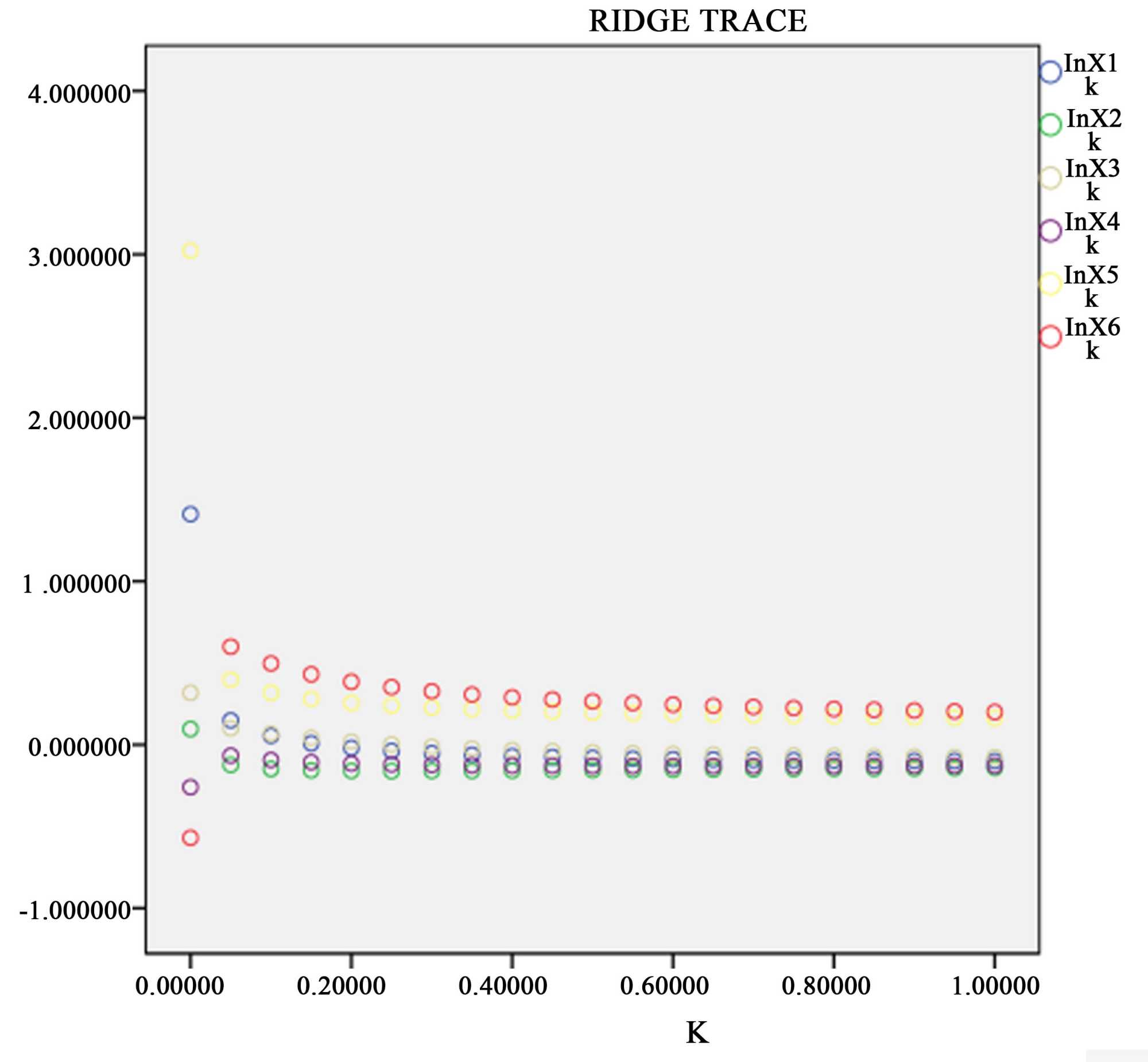 因为模型中的自变量存在多重共线性,所以采用SPSS 24软件进行岭回归分析对该模型进行拟合,设置K取值区间为[0, 1],步长为0.02,得到岭迹图,如图2所示。