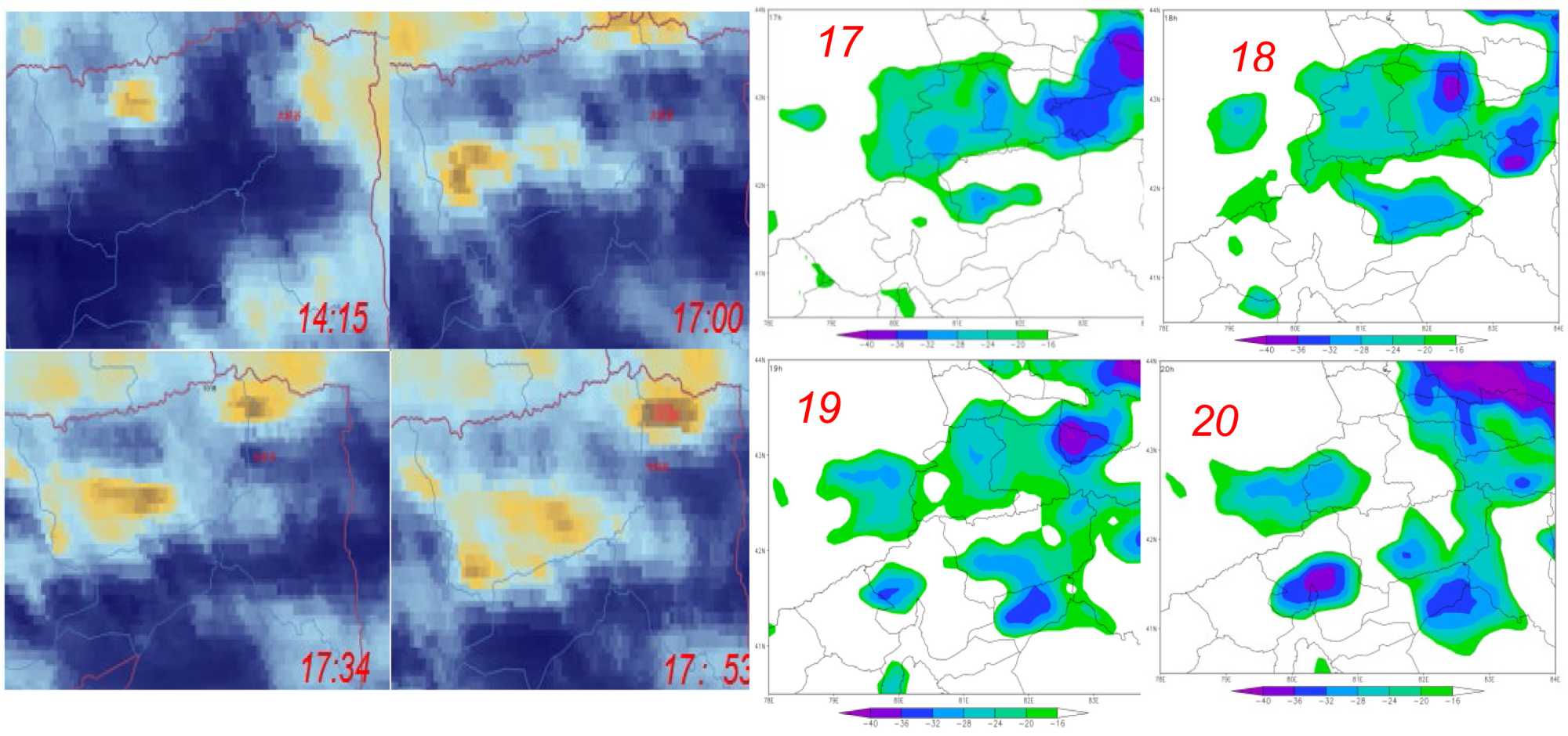 19日中午,西西伯利亚低槽南压分裂短波,在拜城、库车北部山区有积雨云发展(图3),随后,17 h积雨云向南发展加强,在拜城北部山区形成了一个TBB中心,强度达−24~−16℃。17:34在大峡谷景区上游北部阿格乡–东风煤矿一带对流云快速发展,18 h对流云系发展到最强时期,对应在大峡谷景区上游北部山区阿格乡–东风煤矿一带TBB发展中心强度达−40~−36℃,至此阿格乡俄矿新采石场降水12.4 mm,阿格乡明矾沟一带降水量3 mm左右。随后对流云系开始减弱,云系向东移出库车向东部巴州移去。