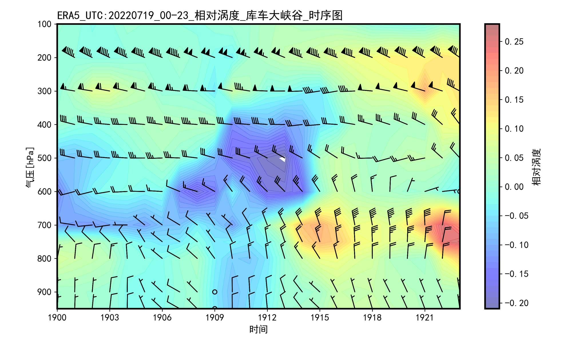 图4. 19日00~23时相对涡度–风场、散度–风场垂直剖面时间序列变化图