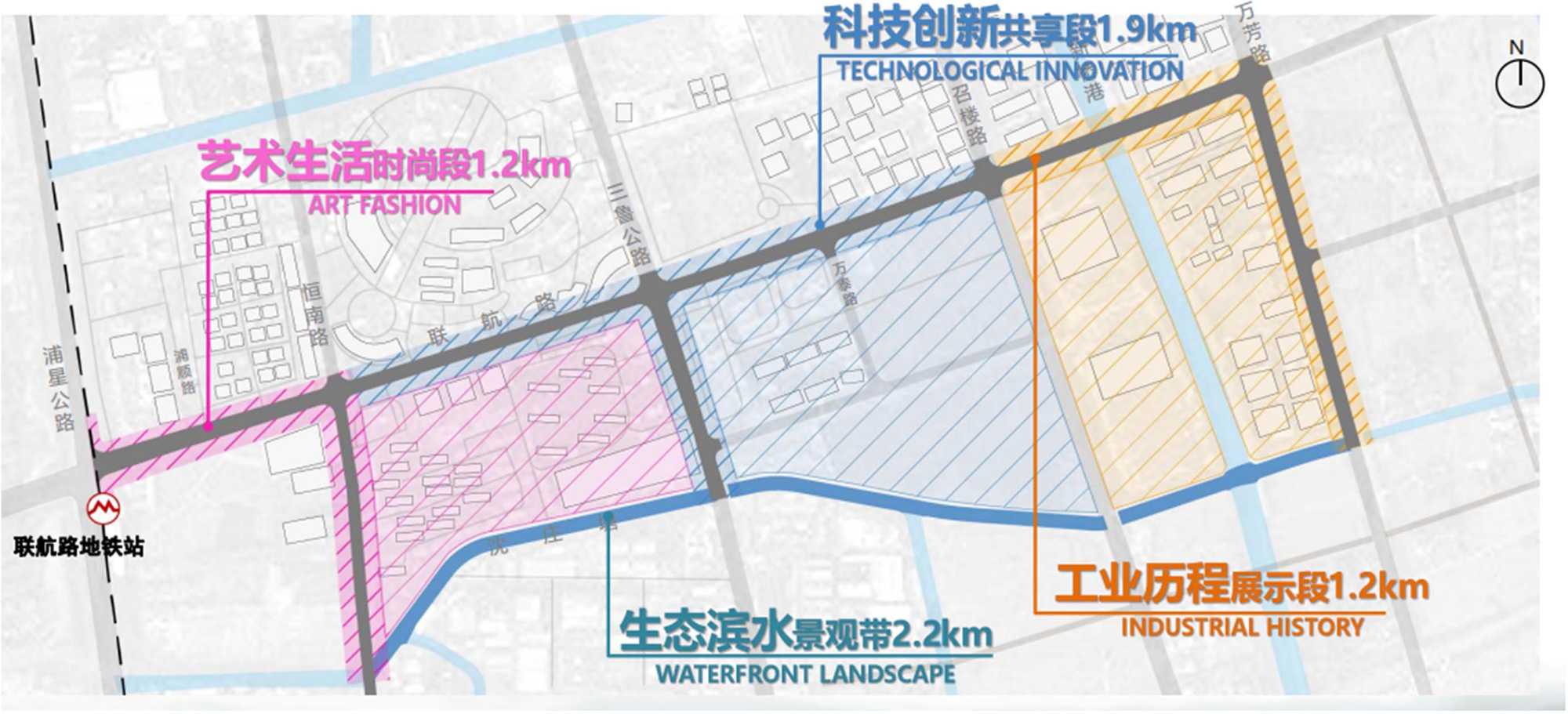 艺术生活时尚段对应艺术片区,由于该片区主要为居住区,居民对艺术和生活美学有较高的需求和关注,故而定位为艺术段。科技创新共享段对应科技片区,该片区周边为商业和科技园区,是现代科技创新的集中地,具有强烈的创新和科技氛围。希望通过展示科技创新成果,打造一个充满科技感的公共空间。工业历程展示段对应工业片区,该片区周边为工业园区,有丰富的工业文化遗产和独特的工业景观。恒南路–万芳路为生态滨水景观带,通过滨水景观设计,营造一个生态和谐、自然美丽的公共空间。设计中将融入生态修复技术和自然景观元素,打造一个供市民休闲娱乐的绿色空间。