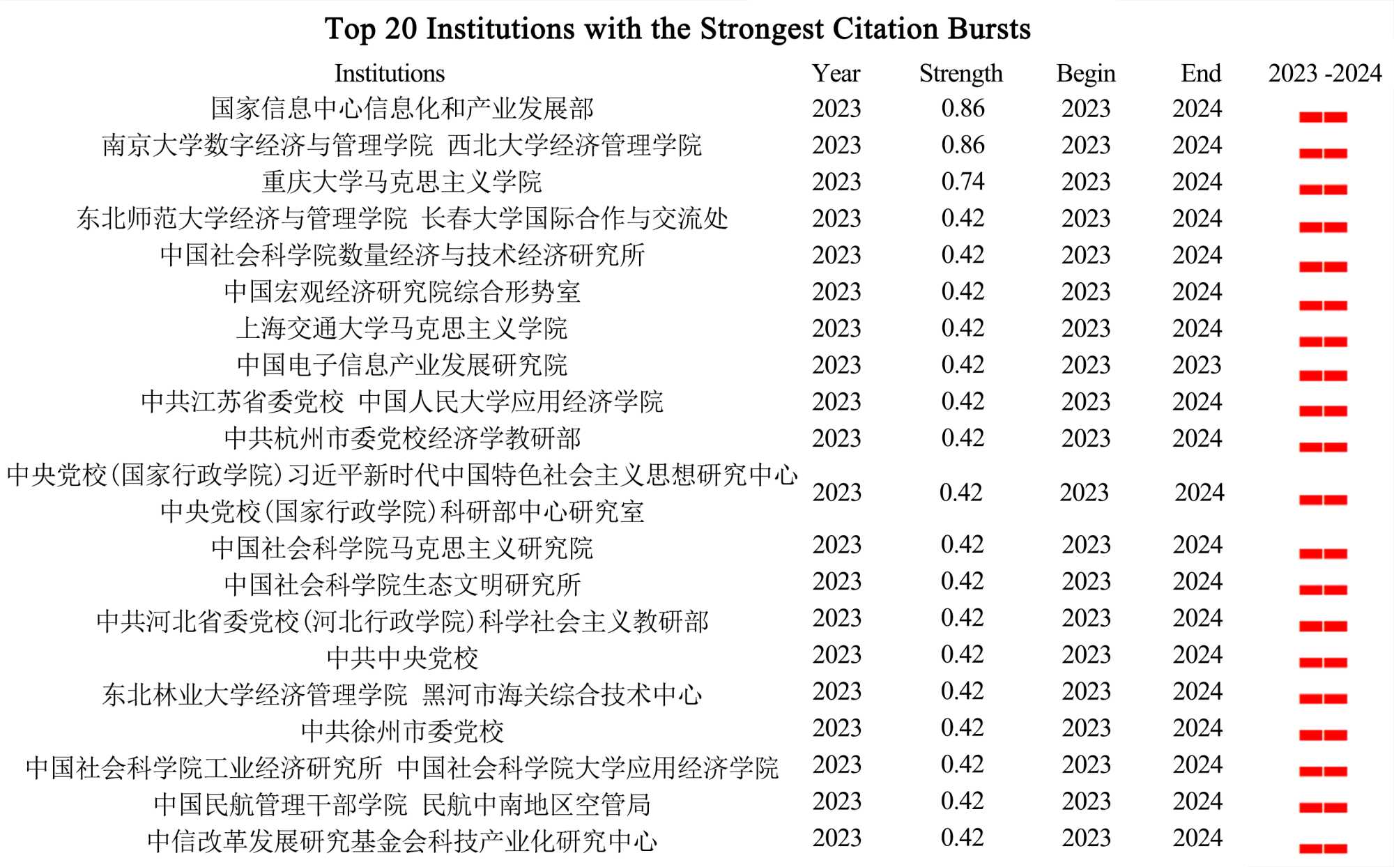 在机构突现图谱中,Strength表示突现强度,Begin表示机构开始相关研究的起始年份,End表示该机构突现的结束年份,深色块为突现时间段,浅色块为以年为单位的时间切片。按照突现词开始年份排序、突现跨度排序、突现强度排序三种不同方式即可得到突现词谱,本文重点观察了突现词开始年份排序[4]。通过观察可知:国家信息中心信息化和产业发展部、南京大学数字经济与管理学院、西北大学经济管理学院和重庆大学马克思主义学院等机构的突现强度大,表明在某一段时间内这些机构发文量较多,取得了较为瞩目的学术成就。