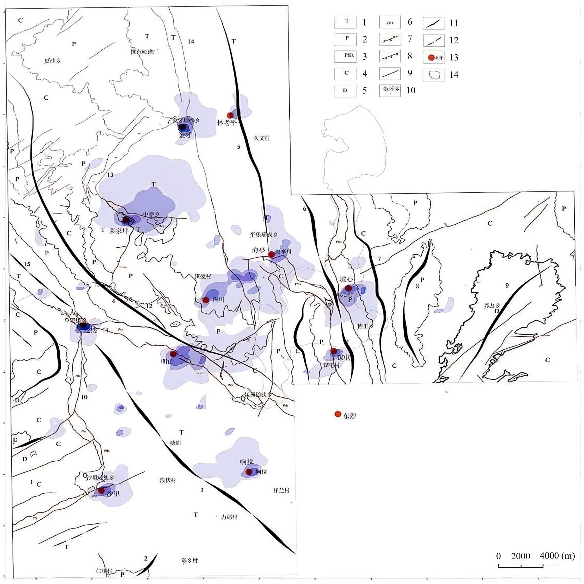 图6. 金牙乡地区靶区预测图(1——三叠系;2——二叠系;3——铅矿化点;4——石炭系;5——泥盆系;6——第四系;7——平移逆断层;8——平移正断层;9——断层;11——背斜;12——向斜;13——矿床)