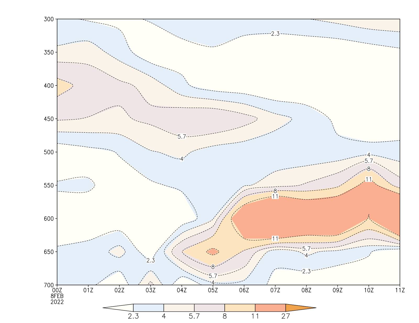3) Ellrod指数计算。Ellrod指数为动力相关颠簸诊断指数,是对锋生函数进行简化得到的,有两种表达形式Ellrod1和Ellrod2 [6]。Ellrod2指数为Ellrod1指数基础上去掉散度项得到,本文中所用Ellrod指数均为Ellrod2。