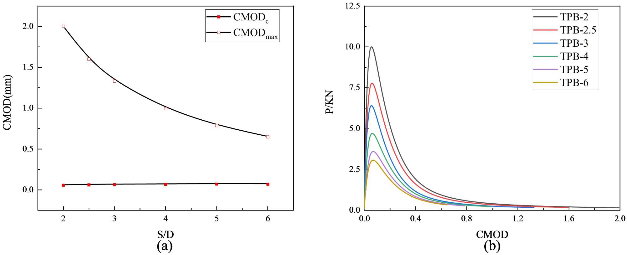 同时根据表2和图5,不难发现随着跨高比S/D的增大,CMOD的临界值CMODc (最大荷载荷载对应处)除了TPB-6以外的试件,都不断增大;CMOD的最大值CMODmax反而不断减小。同时,P-CMOD的斜率以及P-CMOD所围成的面积不断减小。
