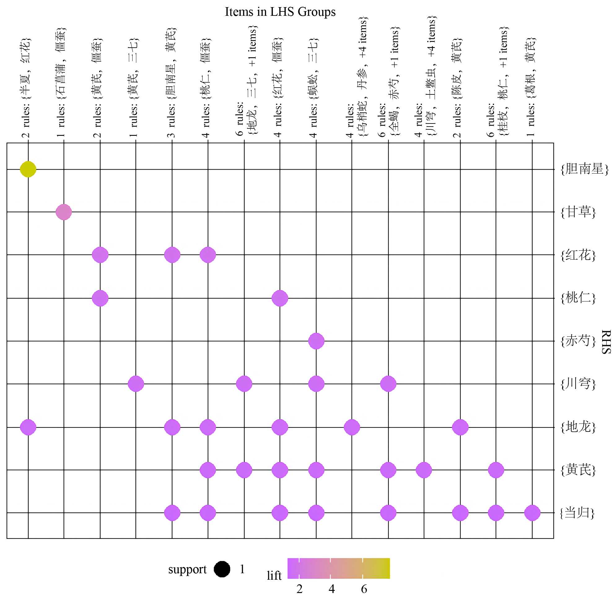 关联规则是反映药物之间的相互关联性,运用R语言对所纳中药进行关联规则分析,当截取的关联规则中的置信度 = 1,说明这几项关联规则是最强组合,进行可视化展示为分组矩阵图、网状图及点状图,结合关联规则表、分组矩阵图及网状图的结果可得到治疗中风后遗症的核心药物为:当归、黄芪、地龙、川芎、桃仁、红花、三七。当归补血活血、润燥滑肠、调经止痛,补血活血、除湿散寒,黄芪补中益气、升阳补肺,地龙通经活络、活血化瘀,川芎活血行气、祛风止痛,桃仁活血祛瘀,红花通经散瘀止痛,三七散瘀止血、消肿定痛。共奏补气活血、祛瘀通络、祛风止痛之功。