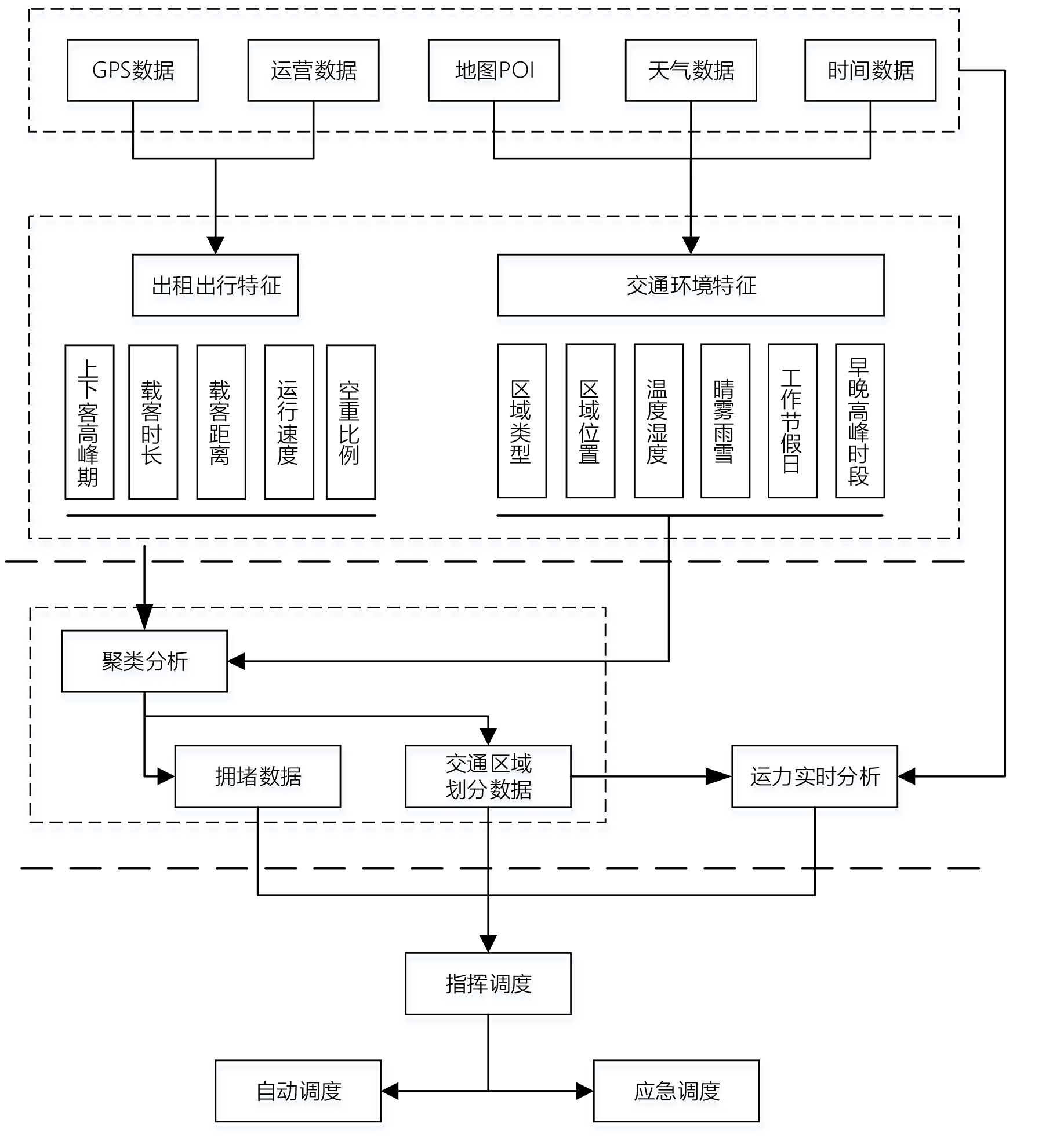 整体分为三个部分:数据特征处理、大数据算法分析、算法模型应用。其中数据特征处理,包括车辆GPS数据、出租运营数据、地图POI、天气数据、时令数据等。大数据算法分析则主要采取聚类算法,如K-means、层次聚类等,通过聚类算法获取能够表现城市出行特征的交通区域模型、区域拥塞模型、区域运力饱和模型等。在算法模型应用部分,则重点在于输入实时数据,对当前交通区域情况进行可视化,按需进行动态调度,以平衡出租出行要求。