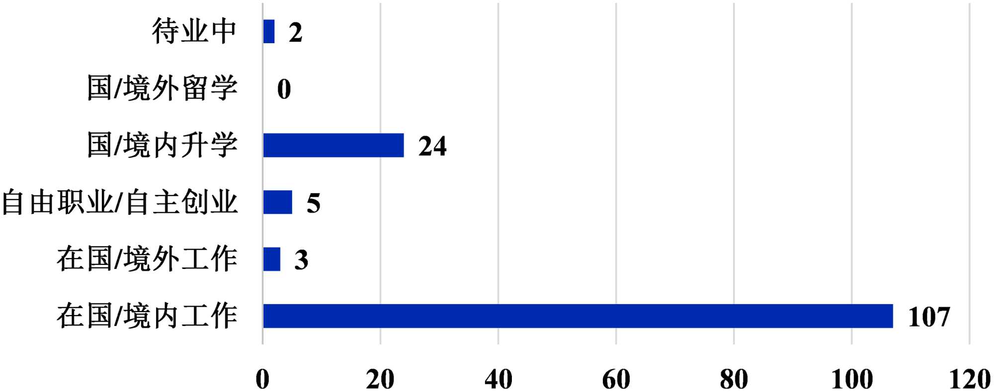 图7为被调研毕业生就业状态统计图:75.89%的毕业生107人选择在国/境内工作,3人国/境外工作。17.02%的毕业生24人选择在国内升学,无人在境外求学。自由职业/自主创业约占被调查对象的5%。