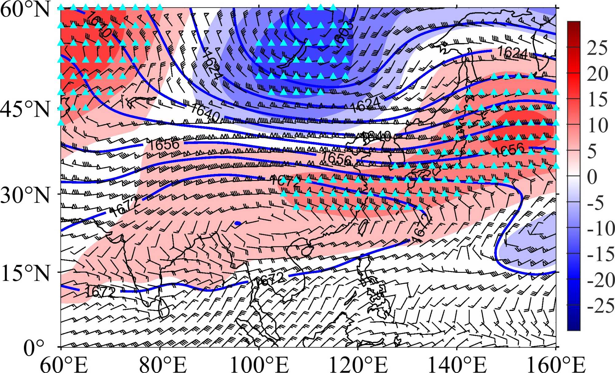 Figure 6. The 500 hPa geopotential heights and anomaly fields (unit: dagpm) averaged in the (a) 26th, (b) 27th, (c) 28th and (d) 29th pentad of 2021. Red line indicates 5880 gpm contour of climate state. Shaded areas indicate geopotential height anomaly. Triangle symbols indicate the values passing 0.05 significance level