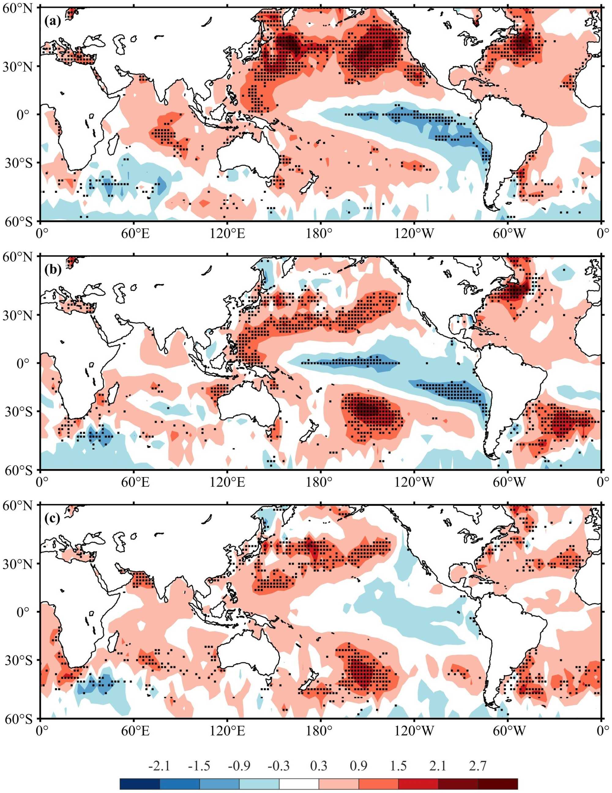 图11. 海温距平分布(单位:℃):(a)2020年9~11月、(b)2020年12月~2021年2月,(c)2021年3~5月。打点区域表示通过0.05的显著性水平检验