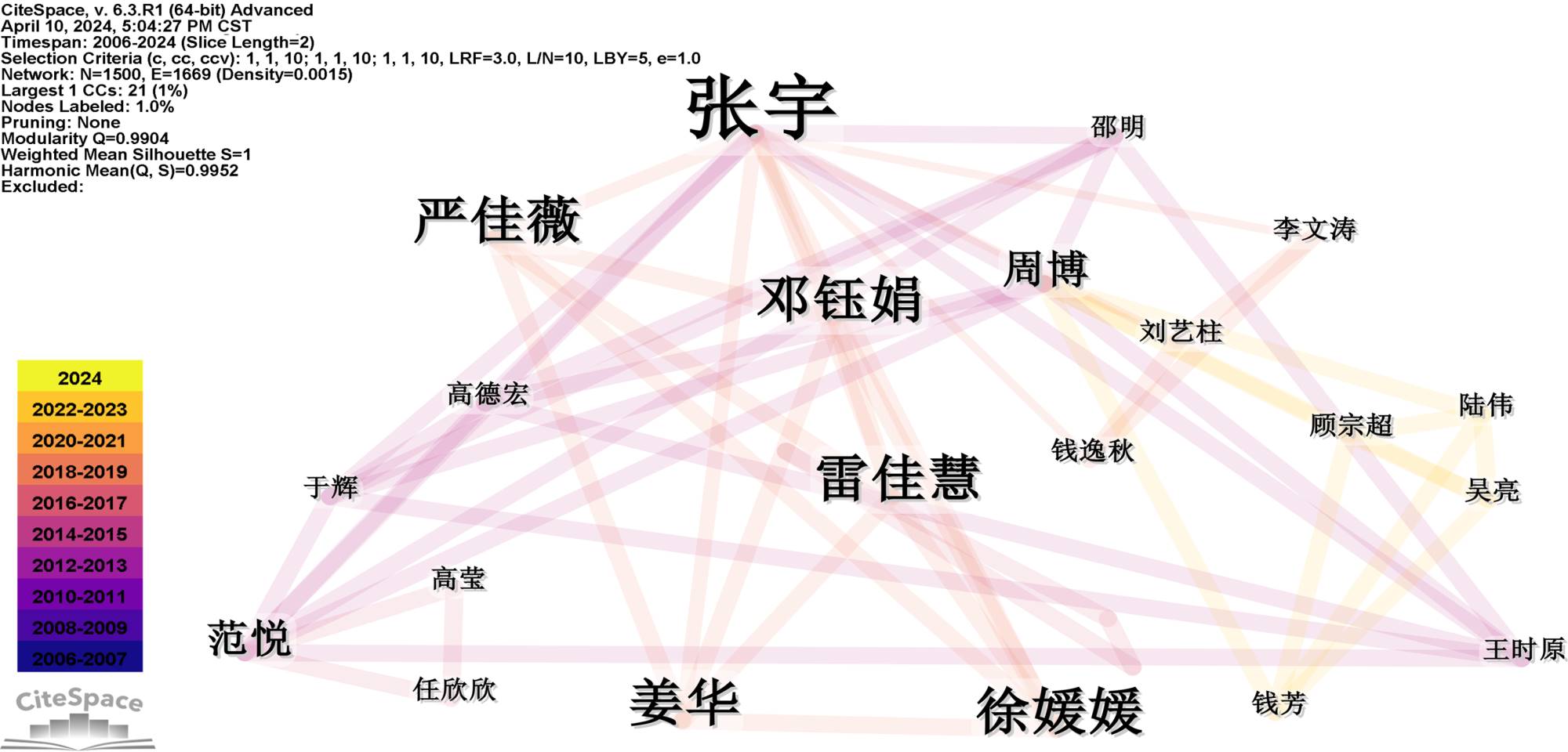 本文选取的主要研究工具为CiteSpace知识可视化软件(CiteSpace 6.3.R1 Advanced)。CiteSpace是一款用于学术文献分析的信息可视化工具[3],可以分析和探索特定领域研究成果的整体状况以及该领域研究的热点和前沿[4],具有作者合作分析、关键词共现分析、机构合作分析、作者共被引分析、文献共被引分析等功能[5]。