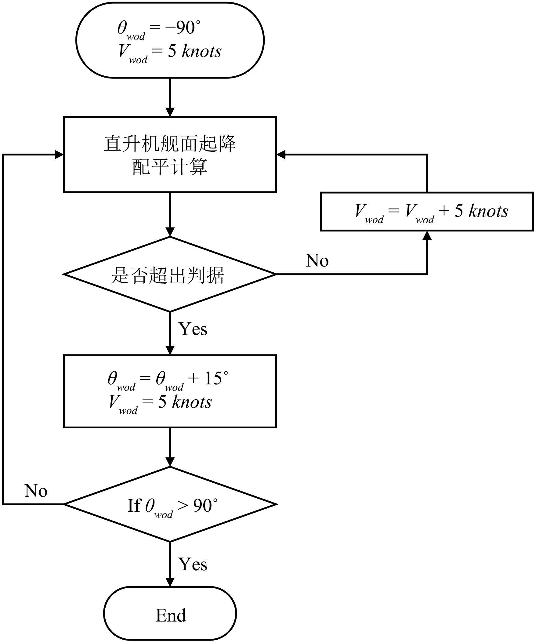1) 从风向角−90˚ (左舷来流为负,右舷来流为正),风速5节开始计算,通过配平计算得到直升机7个判据参量,与上述判据进行对比,判断7个参量是否超出。若未超出,进入下一步;若超出,则认为该风向并不适合直升机进行舰面起降。