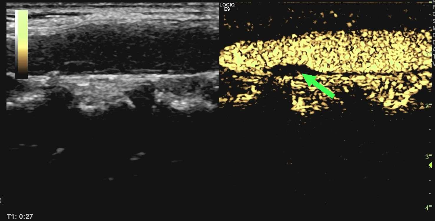 根据超声造影增强情况对斑块内新生血管进行半定量评估:0分(斑块中没有造影剂信号),1分(斑块中点状造影剂信号),2分(介于1~3分之间,斑块内可见到点状和1~2支短线状增强),3分(斑块中有多发的线状造影剂信号)。见图1和图2。