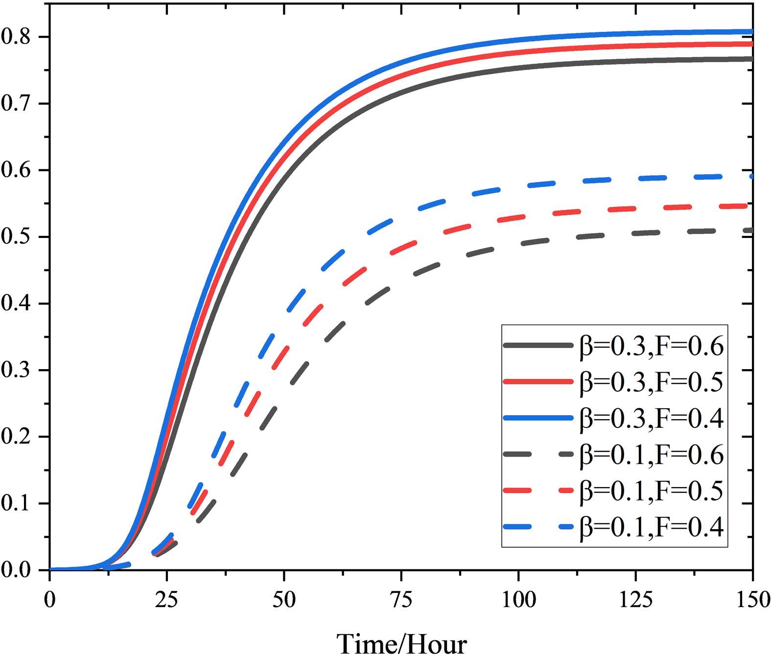 情境3:不改变监管力度(P = 0.4),通过在网络媒体上发声来影响舆情传播(在6 h将z设置为1)。以下讨论公信力(f = 0.002, 0.01, 0.02, 0.04, 0.06)对网民传播舆情行为的影响,模拟结果如图4所示。