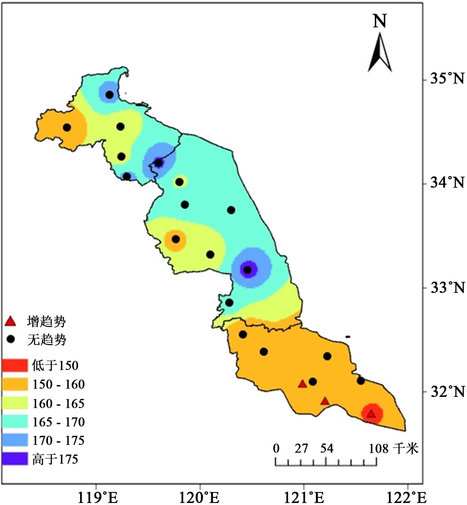 1961~2022年沿海地区各极端降水指标空间分布特征明显。PRCPTOT指数呈纬向递减,高值区位于南通市大部分地区,其中通州站年均值最大,约1100 mm,低值区位于连云港市东海站,年均值约880 mm,仅南通市有50%的站点呈上升趋势(图7(a)),其他地区趋势不明显。R95P指数的高值区在盐城南部、南通市,低值区主要位于盐城市建湖县、射阳县部分地区以及连云港市西部地区,年均值在266 mm左右,通州站和启东站有上升趋势(图7(b))。R99P指数的高值区仍位于盐城南部和南通市,低值区相对于R95P范围明显缩小,最小值为73.1 mm (图7(c))。可见以上3个指数的空间分布趋势相似,均呈南高北低分布。与之相反,RX1DAY指数、RX5DAY指数和SDII指数的空间分布大致为南低北高特征(图7(d)~(f)),但是有增长趋势的站点仍然位于南通市。