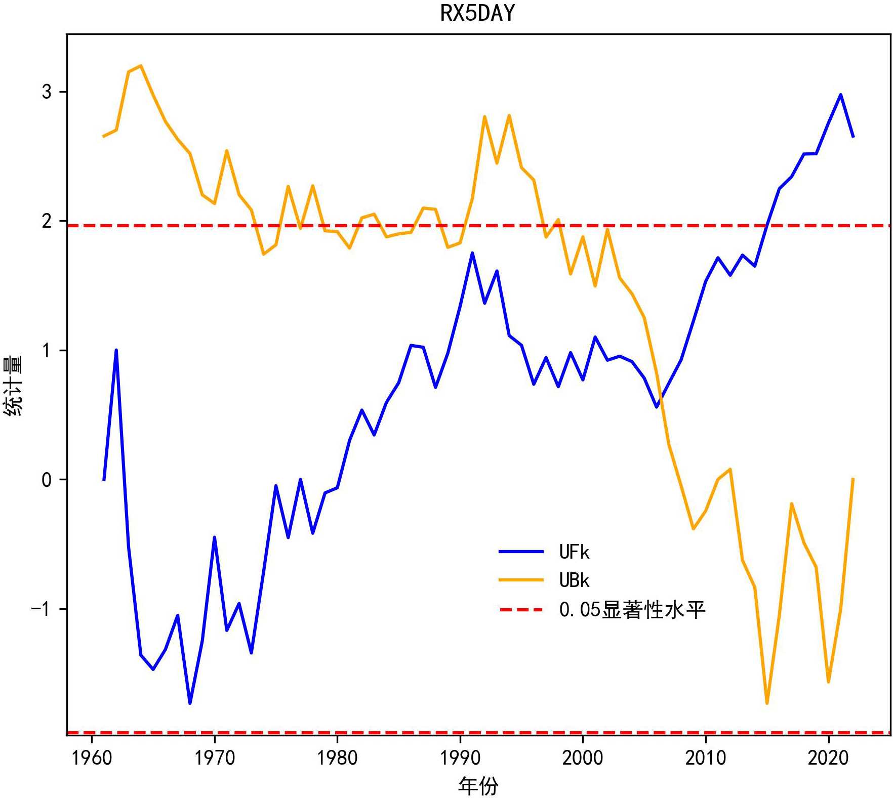 相交且交点位于临界线内,那么交点对应的时间即为突变开始时间,若两者存在多个交点,则突变年份无法确定;若交点位于临界线外,说明交点没有通过显著性检验,不具有突变性。
