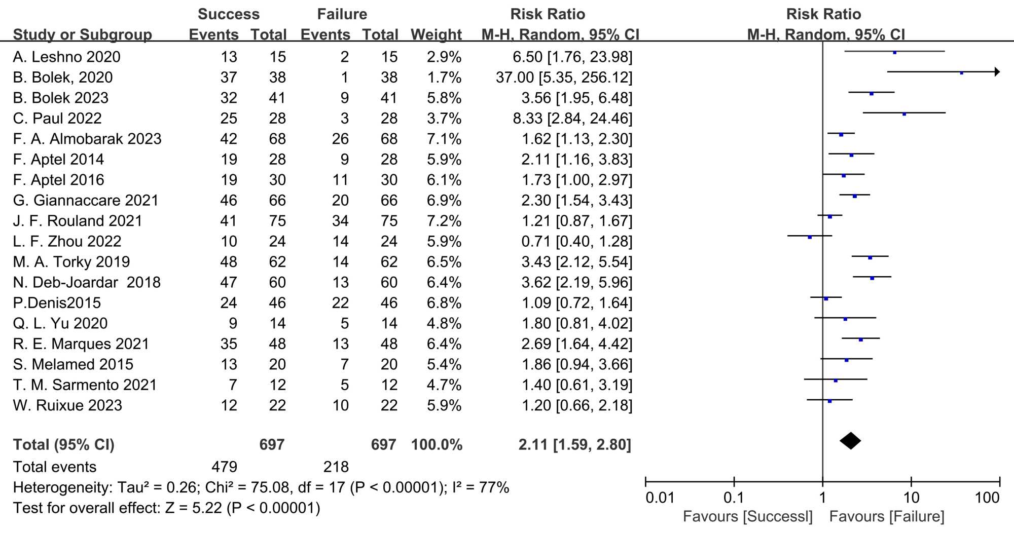 我们从此次Meta分析中得出的结论是:UCP治疗青光眼是安全和有效的。UCP能够有效的降低青光眼患者的眼压,且患者术后眼压在短中期内稳定,患者术后使用降眼压药物的数量得到显著减少。在大多数文章中,UCP治疗青光眼的成功率高于失败率,但Zhou [9]等人的研究结果却相反,见图4,我们推测是由于纳入患者中超过75%的患者是新生血管性青光眼(Neovascular Glaucoma, NVG)和继发性青光眼,这类患者病情复杂、基线IOP较高,更难以治疗。