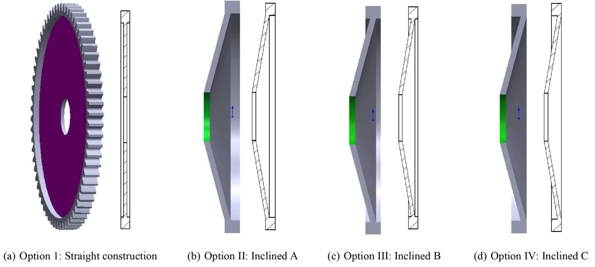 齿轮轴的腹板部分设计分为4种方案:方案一为直腹板结构,方案二~方案四均为斜腹板结构,其斜板面相对齿轮面的角度分别为30˚、20˚、10˚,可优化齿轮轴的腹板厚度为3 mm。由于Z5齿轮轴的齿轮腹板较厚(6 mm)且直径较小,可进行优化的空间不多,故保持原有结构不变。Z6、Z7、Z9齿轮轴优化方案如图2所示,Z8齿轮轴的优化方案如图3所示,其腹板面和轮齿面相对位置不同。