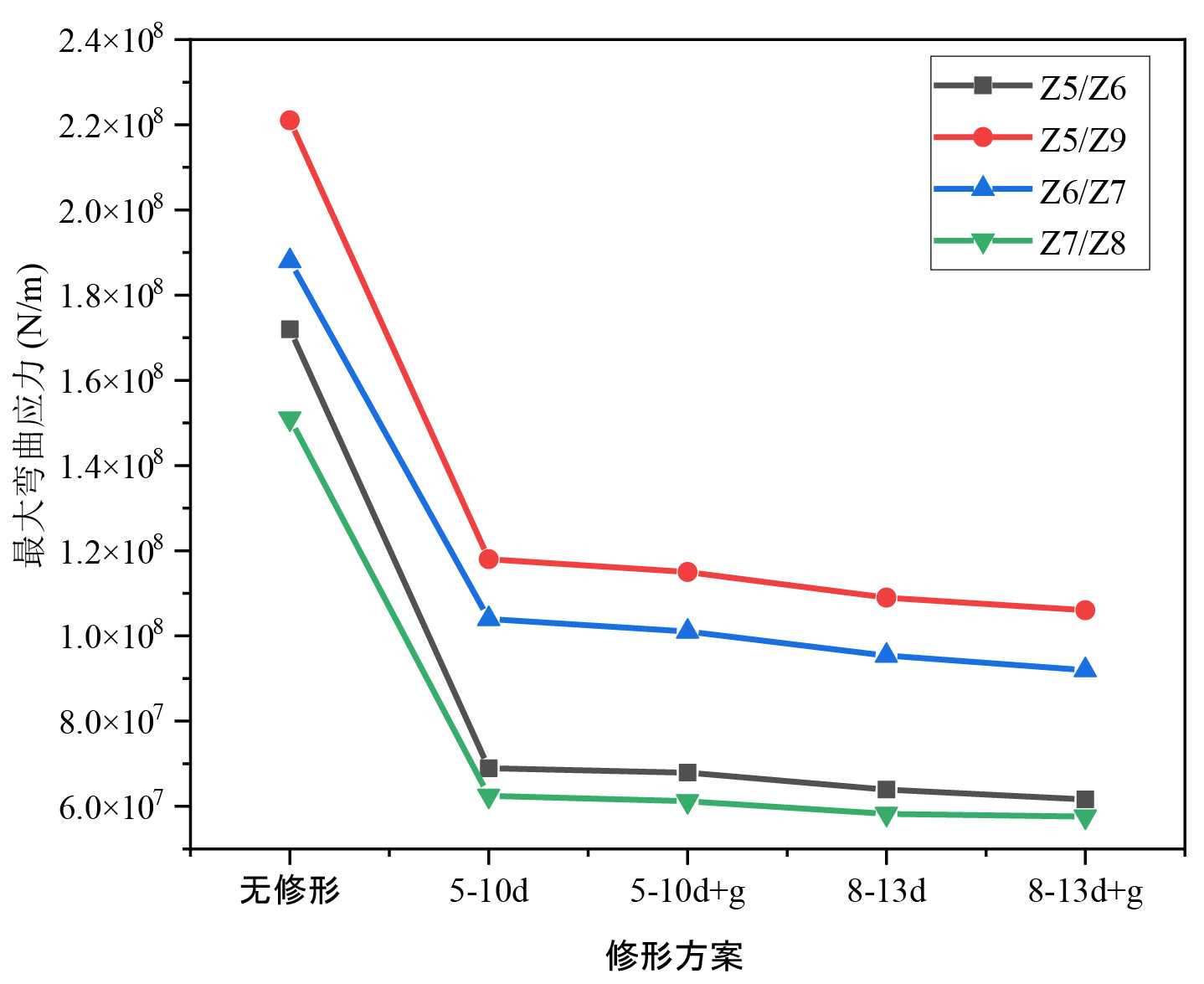 对比齿轮副啮合齿根处最大弯曲应力值(图6(b)),与最大接触应力结果类似,采用斜形腹板优化结构的齿轮副,最大弯曲应力均增大。其中,斜形B类腹板齿根弯曲应力增加最少,Z5/Z6、Z5/Z9、Z6/Z7、Z7/Z8齿轮副啮合齿根弯曲应力相应分别增大了2.0%、3.2%、3.9%、1.4%。对于Z7/Z8齿轮副,采用斜形C类腹板结构较优。因此,对于不同类型优化齿轮腹板结构的方案,直腹和斜腹结构,均会影响齿轮的接触应力分布和弯曲应力分布,但对弯曲应力分布影响较小。结合接触应力与弯曲应力对材料寿命影响,得出齿轮优化方案的合理性,从结果可以看出接触应力和弯曲应力的影响主要体现于结构设计上,不同的齿轮副运行方向和斜腹板结构的不同角度,均会影响齿轮副的使用寿命。
