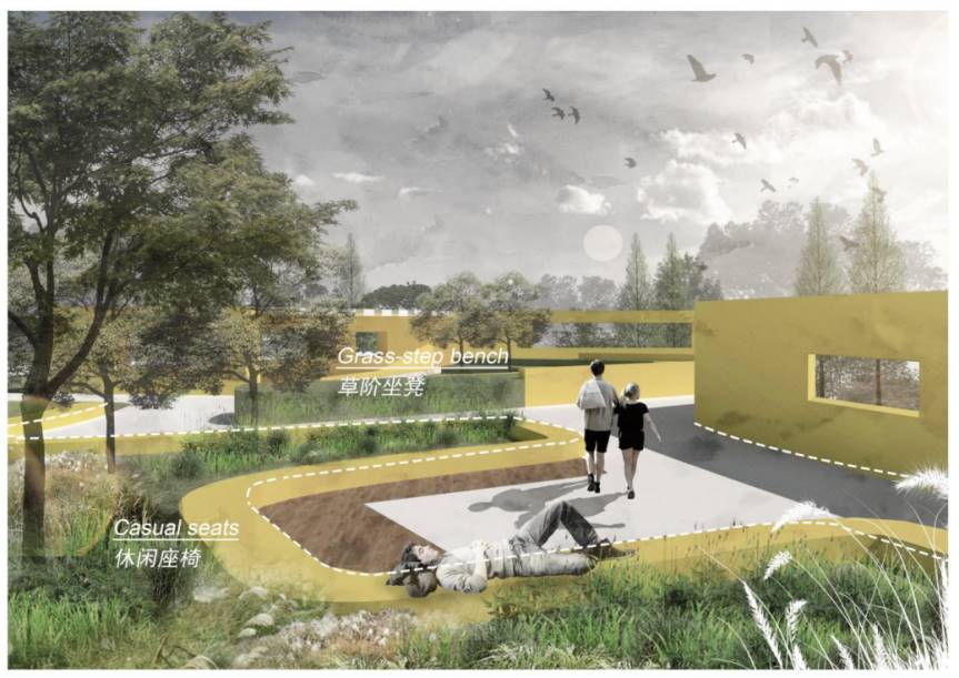 首先引入历史演进过程,引导构建文化廊道。对于历史过程的提取与转译,对于场地的历史元素提取转译,使其成为湿地公园中可以被人们熟知且欣赏的景观。文化体验营造,对于文化元素提取后进行文化元素的景观化[12],首先在文化景观前改善铺装与可达性,增强引导性,其次增加景观装置宣传文化,最后将现有建筑肌理保留,适当改建,使建筑功能更合理,更有助于对于文化精神的传达。
