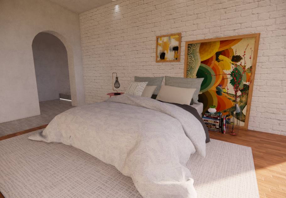 卧室的设计保留了拱门形状,八大关别墅区属于文化保护单位,集万国建筑风格于一处的八大关也是当地知名特色,如图8,在这里将原有传统造型保留,在与现代材料、颜色加以修饰,复古的墙面和拱门的造型更能凸显出国外洋楼的设计特点。与此同时,传统与现代相结合,照顾人与环境之间的情感,这同样是很重要的一部分。在卧室中墙面的材质采用最原始的白色砖墙饰面,也意味着是回归本源,用最原始的材料打造出幽雅的室内居住空间,整体暖调的颜色搭配烘托出温暖舒适的居住空间。